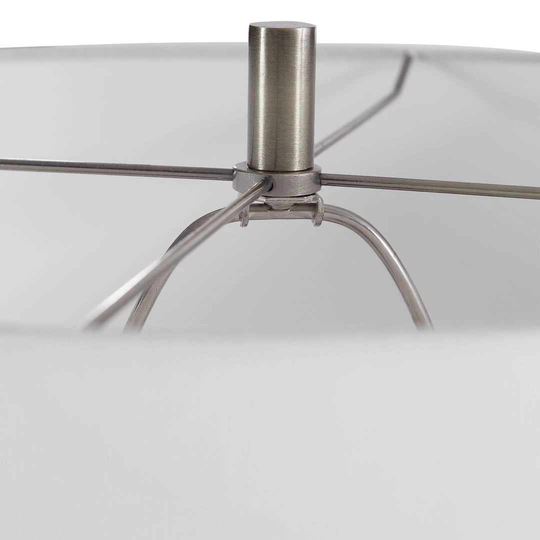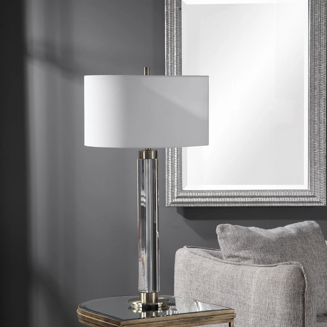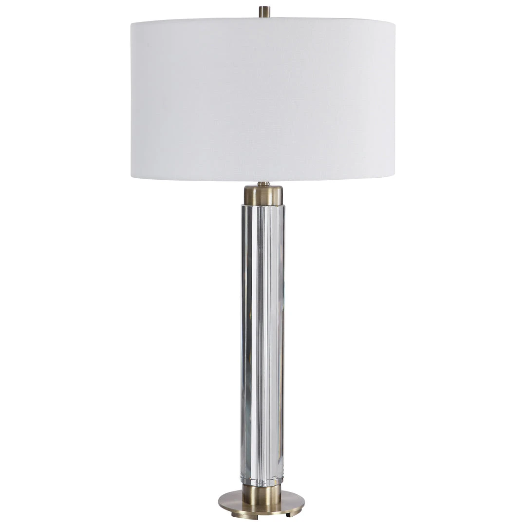 Contemporary In Style, This Cut Crystal Table Lamp Showcases Clean Lines, Accented With Lightly Antiqued Brass Plated Details. The Round Hardback Drum Shade Is A White Linen Fabric.