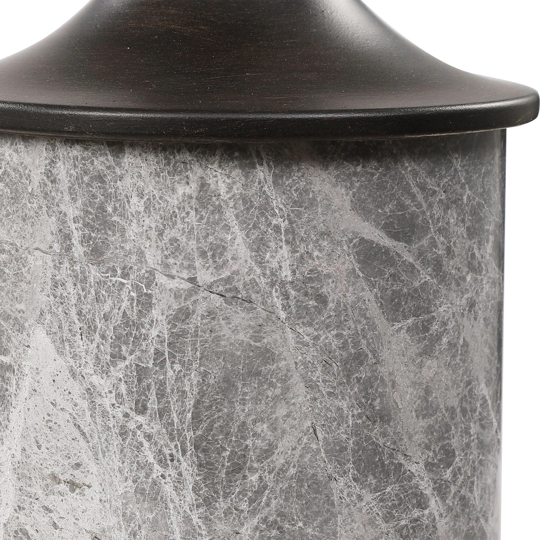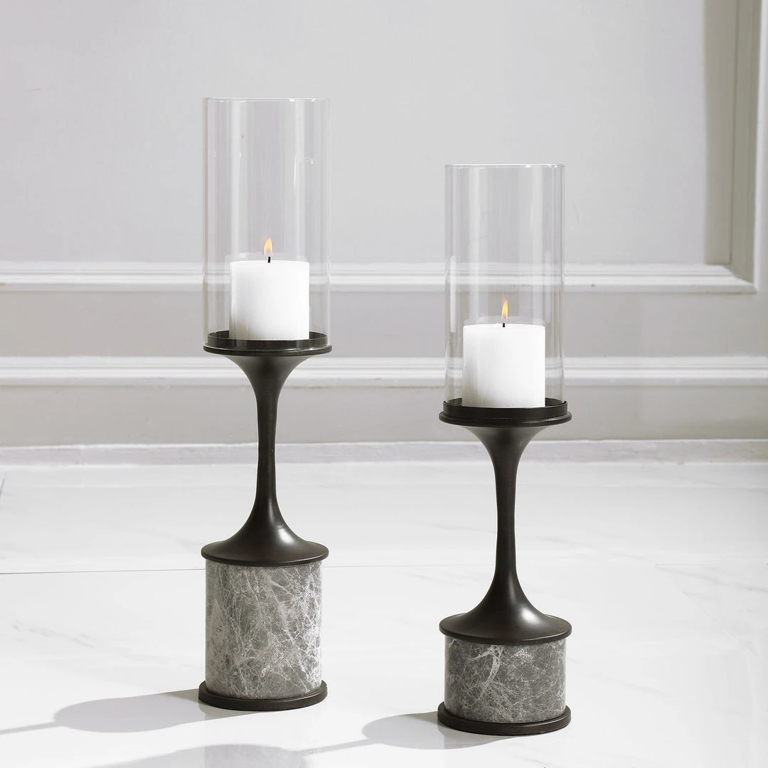 Set Of Two Candleholders Feature A Fluted Iron Base Finished In A Dark Gunmetal With Smoke Gray And White Marble Accents And Clear Glass Hurricanes. Two 3″x3″ White Candles Are Included. Sizes: S-5x20x5, L-5x22x5
