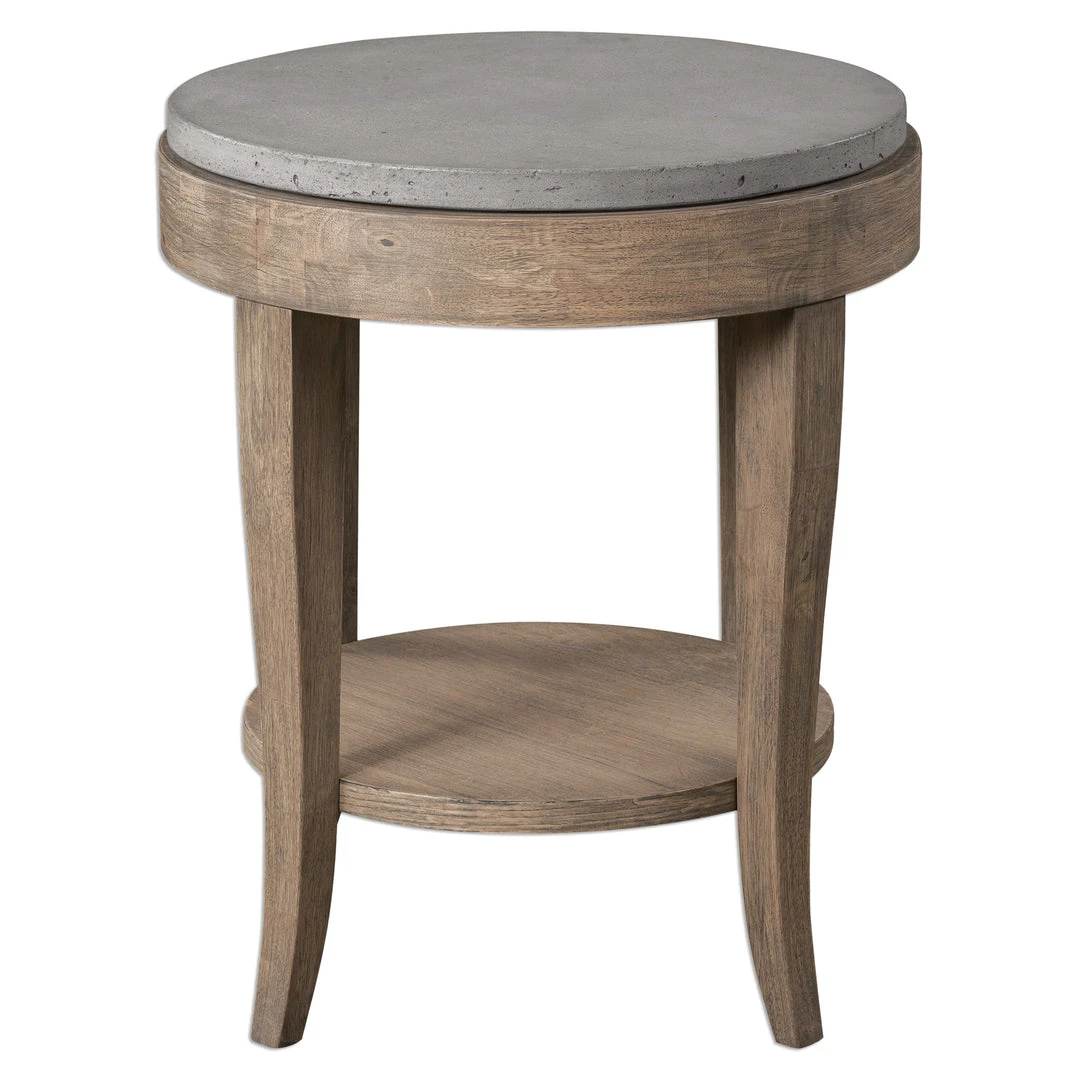 A Casual Farmhouse Inspired Side Table With Birch Wood Veneer, Finished In A Natural Brown Glaze With A Solid Poured Concrete Surface Top.
