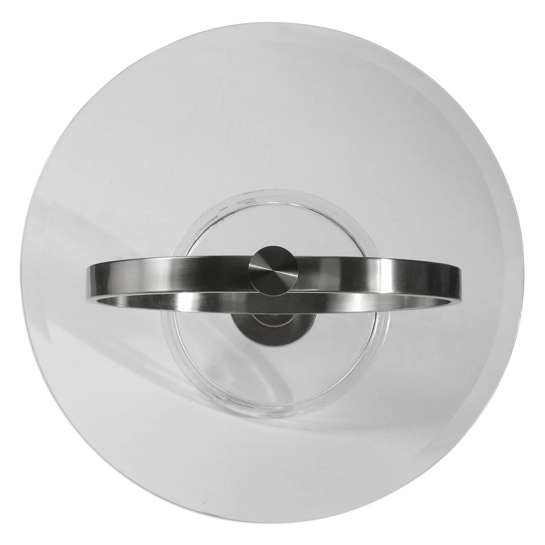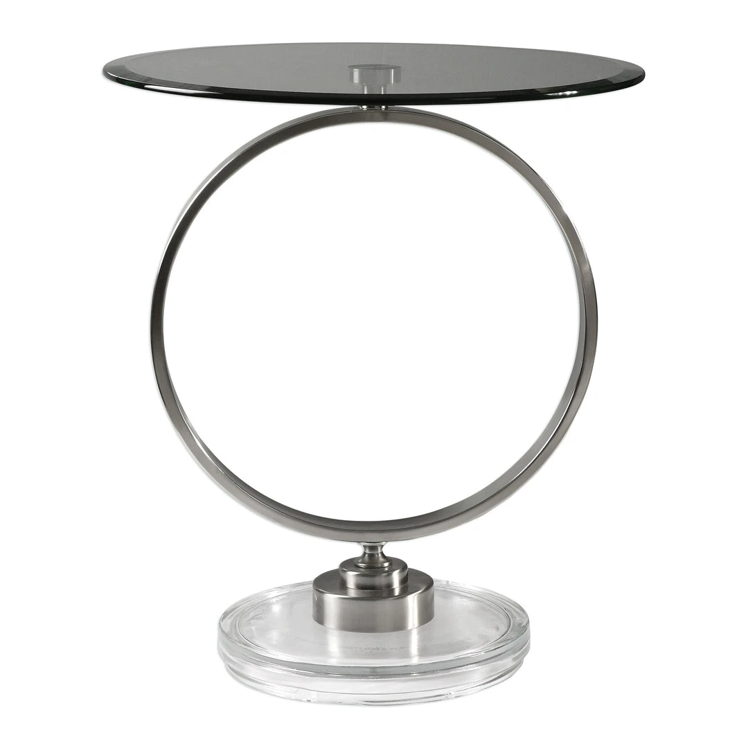 Simplistic And Contemporary, Featuring A Ring Of Brushed Nickel Plated Iron With A Thick Beveled And Tempered Glass Top, On A Chunky Rounded Block Base.