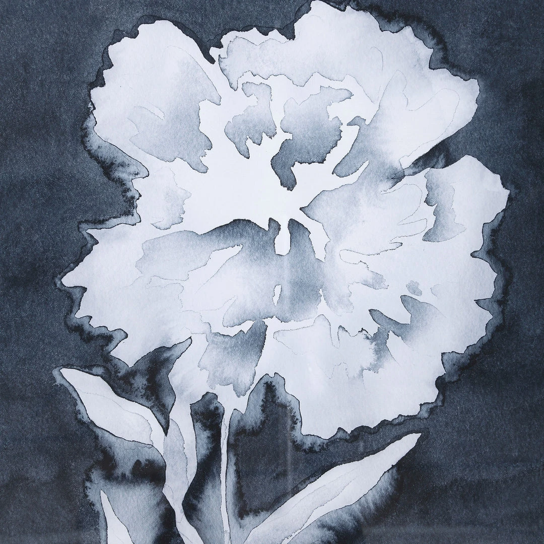 These Timeless Floral Designs Showcase Watercolor-style Botanical Images In White Against A Deep Navy Blue Background. Each Print Is Complemented By A Large Silver Leaf Profile Frame And Is Placed Under Glass.
