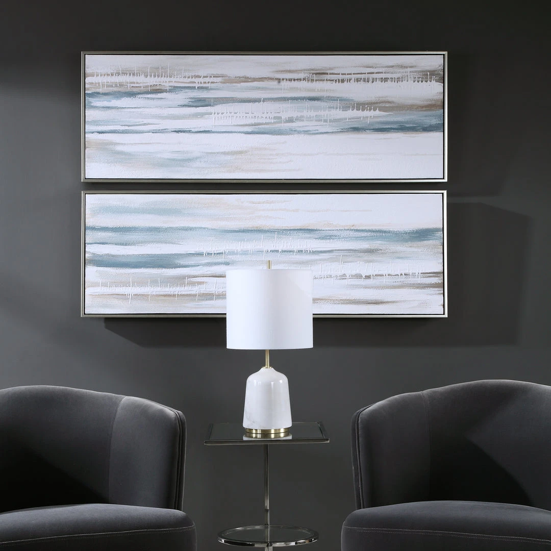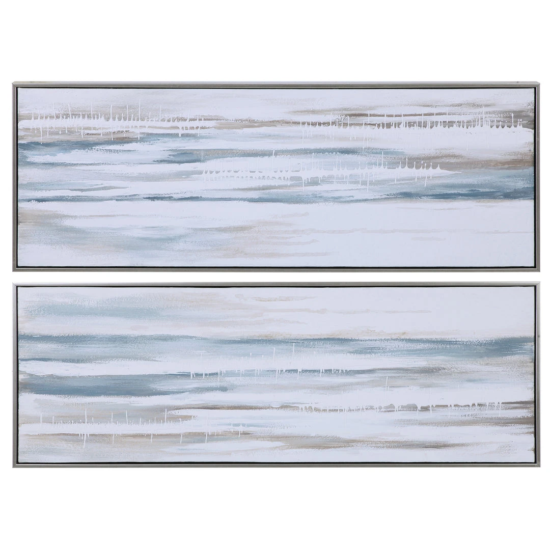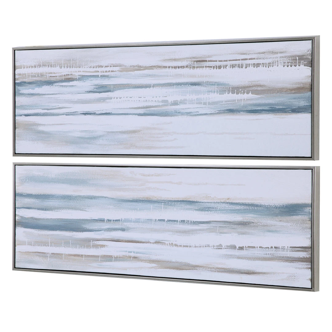 These Hand Painted Abstract Pieces Showcase A Soothing Color Palette With White, Charcoal, Taupe, And Gray Blue Tones. Each Is Accented By A Silver Leaf Gallery Frame. Due To The Handcrafted Nature Of This Artwork, Each Piece May Have Subtle Differences.