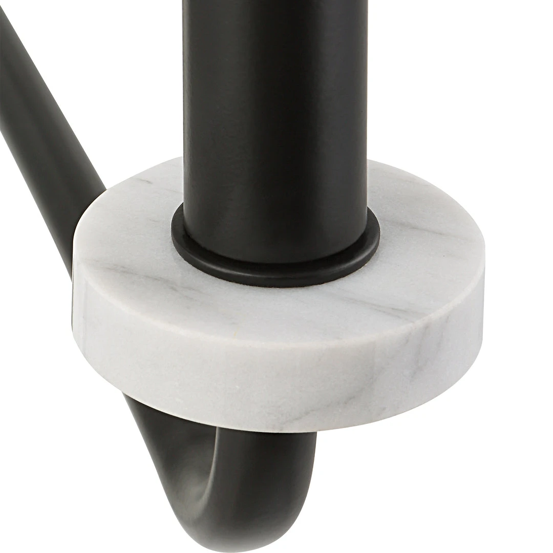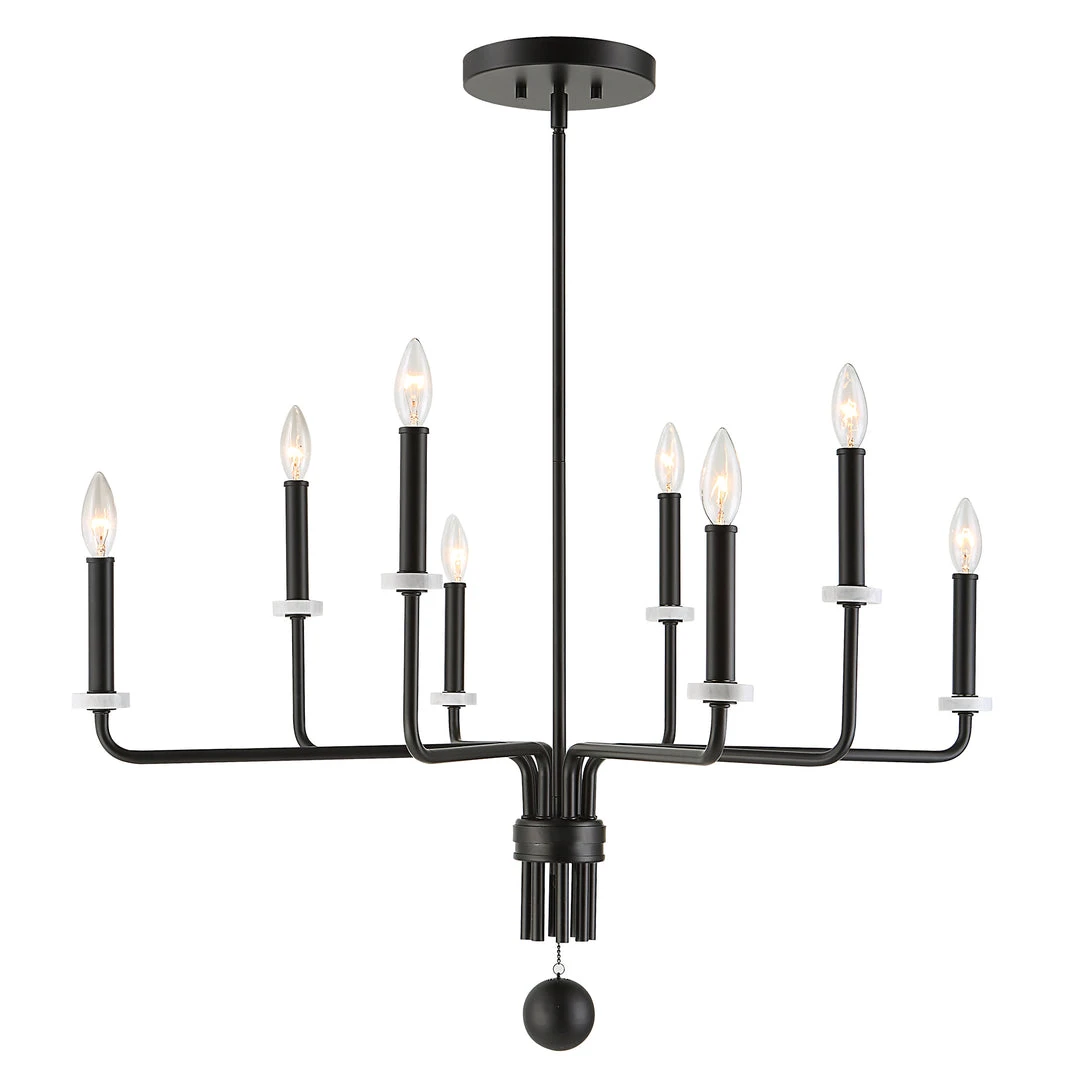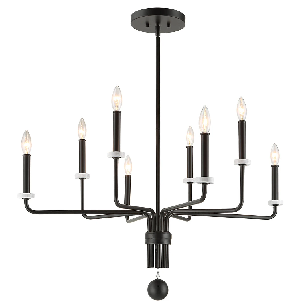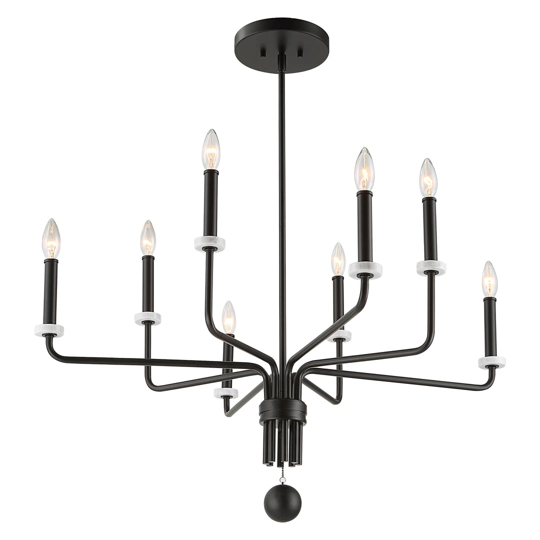 Modern & Sleek Softly Bent Lines Give This 8 Lt. Chandelier A Dramatic Feel, Finished In A Deep Matte Black With Chic White Marble Disc Bobeches. With 8-60 Watt Max, Candelabra Sockets. Supplied With 15′ Wire, And 3-12″ Stems & 1-6″ Stem For Adjustable Installation.