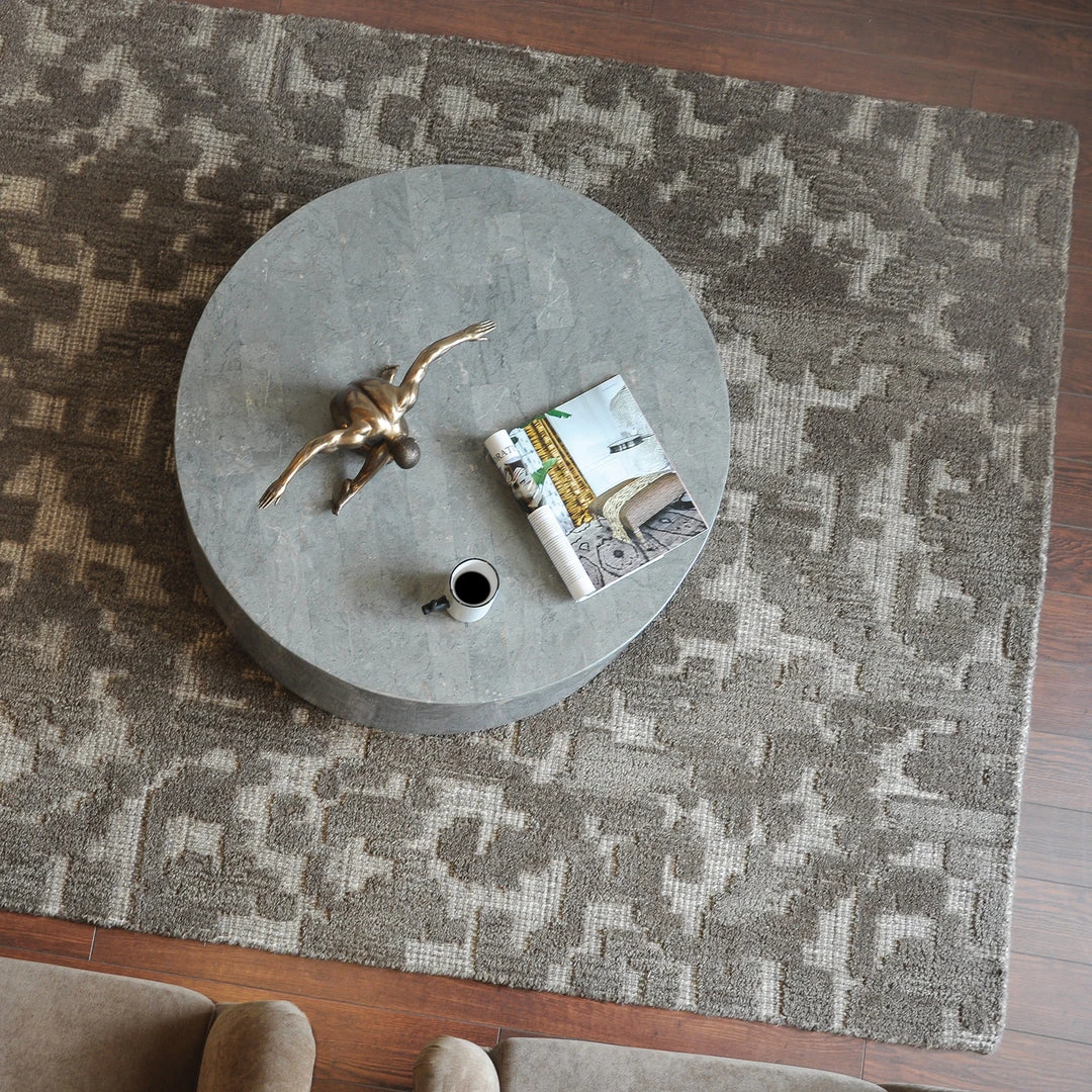 This hand tufted gray wool rug features an over tufted abstract design cut in a short pile.