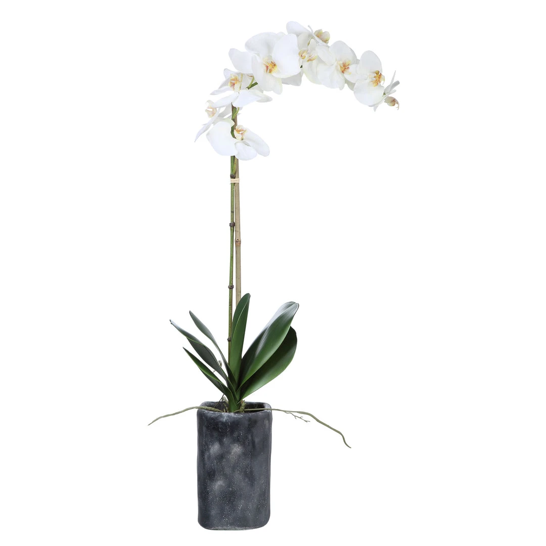 A Gracefully Arching Stem Of White Orchids Over A Bed Of Faux Potting Soil, Placed In A Contemporary Mottled Charcoal Gray Concrete Planter.