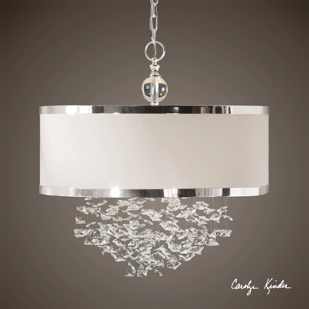 The Classic Appeal Of Crystal Is Updated For Todays Sophisticated Tastes, With Free Falling Crystals And A Silver Trimmed, Antique-white Linen, Drum Shade.
