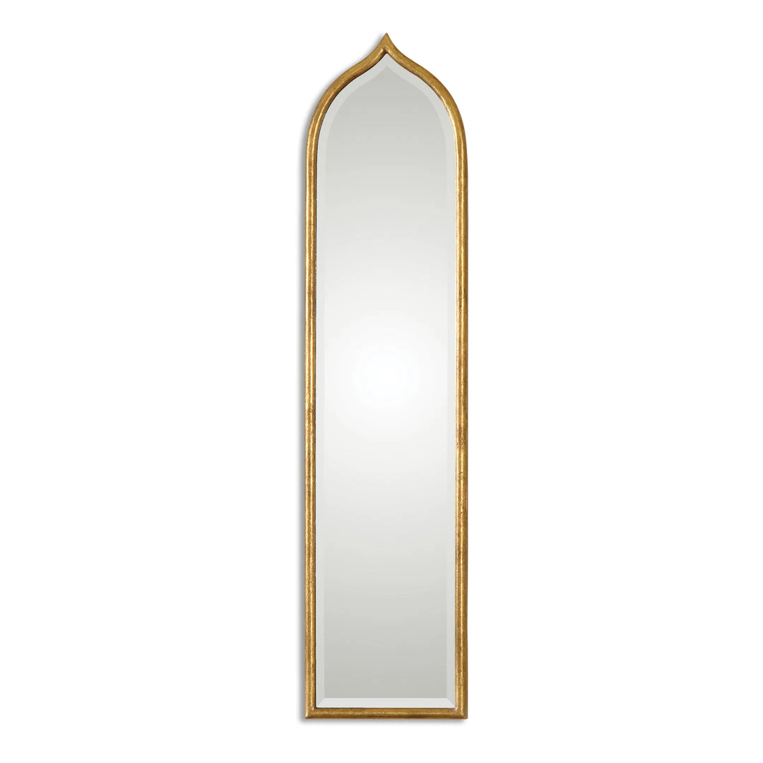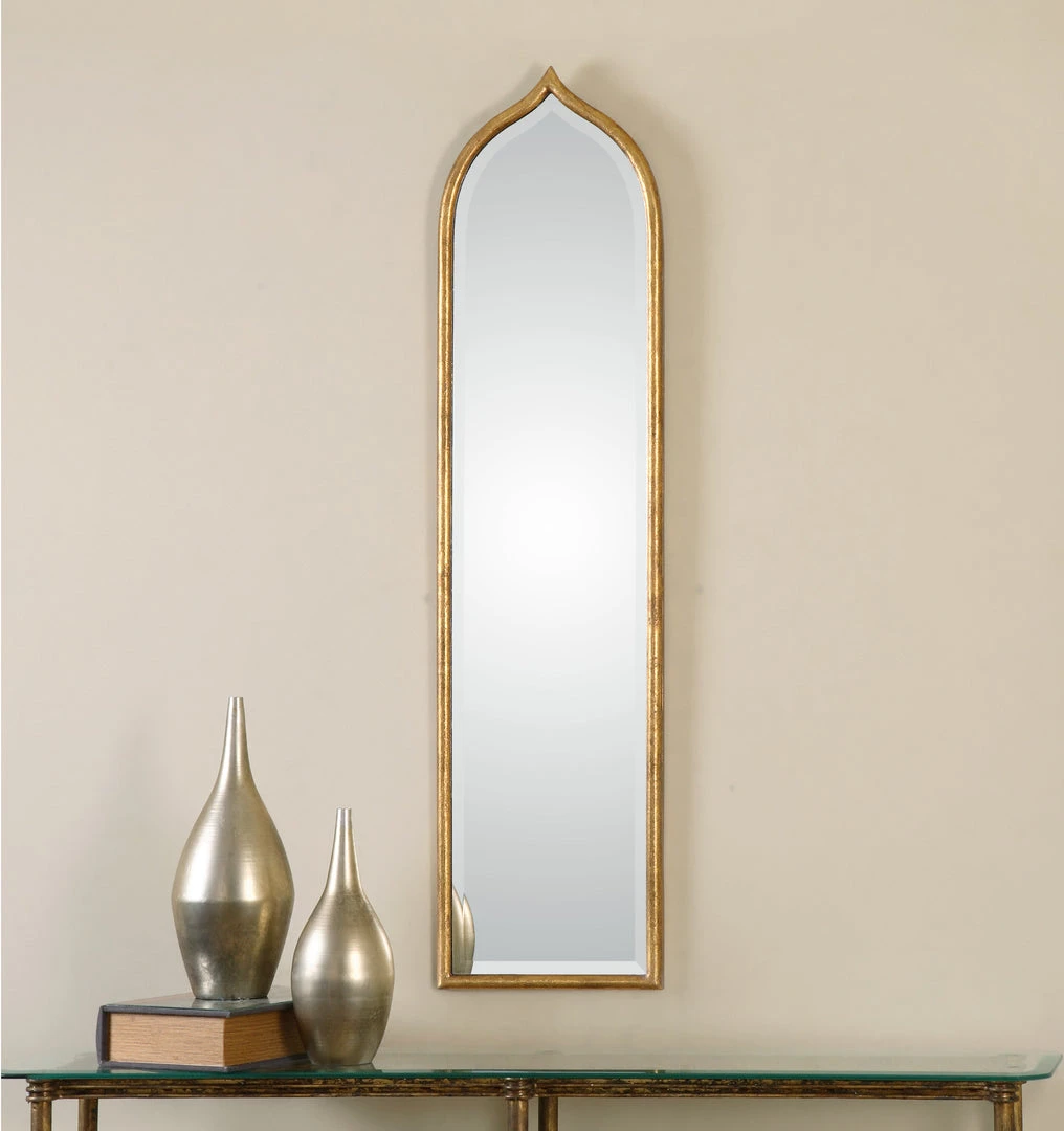 Rounded, Metal Frame Finished In Lightly Antiqued, Gold Leaf. Mirror Has A Generous 1 1/4″ Bevel.