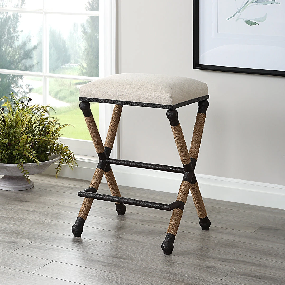 Rustic Iron Frame With A Nautical Touch, Wrapped In Natural Fiber Rope Accents. Cushioned Top Is A Sturdy, Cotton In A Neutral Oatmeal With Performance Treatment. Seat Height Is 28″.