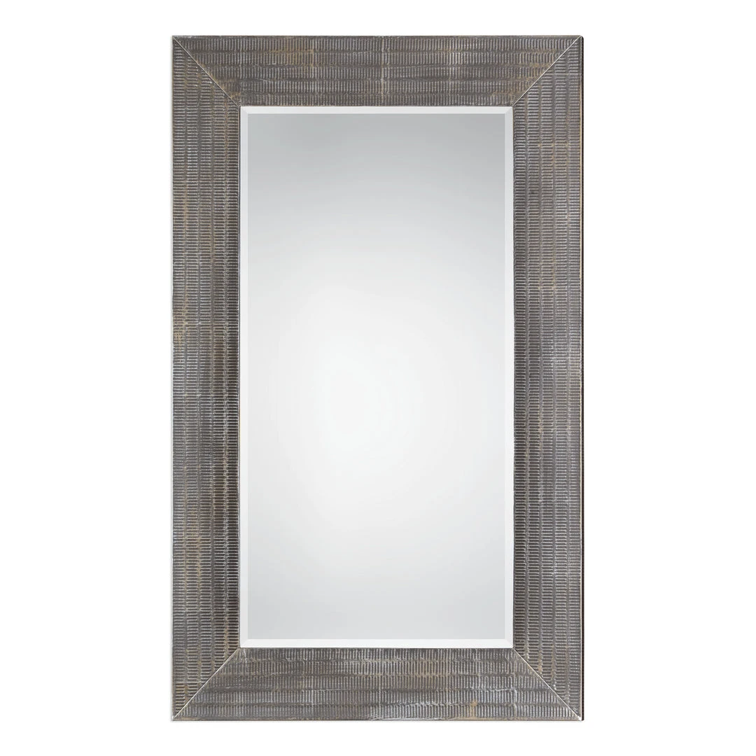 Flat Profile Frame Features Heavily Textured, Embossed Steel Finished In A Stone Gray Wash. Mirror Has A Generous 1 1/4″ Bevel. May Be Hung Horizontal Or Vertical.