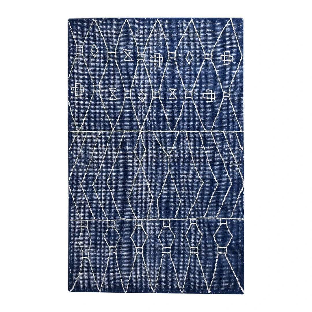 Hand woven, over dyed, indigo blue wool, featuring a bold white tribal inspired design.