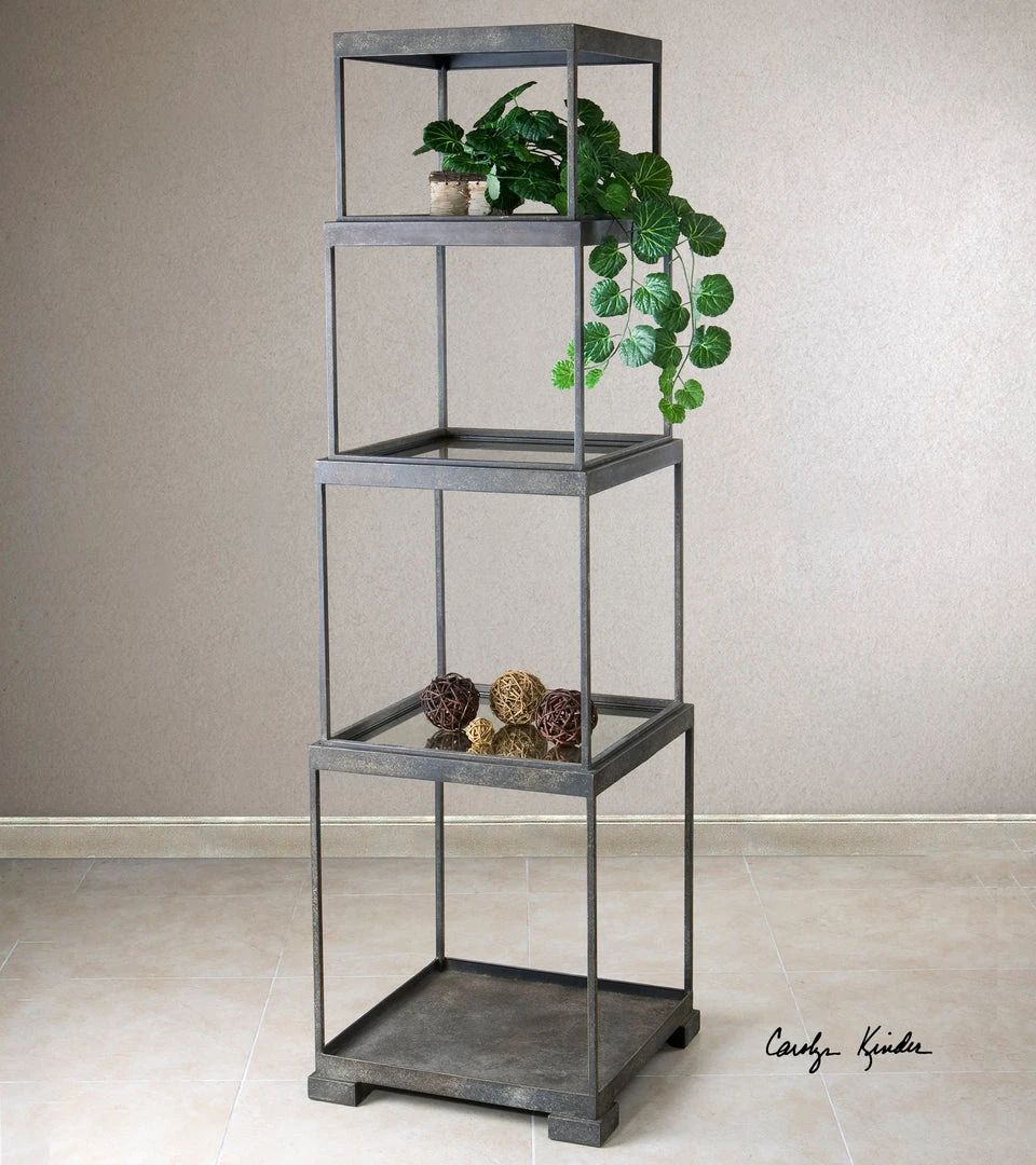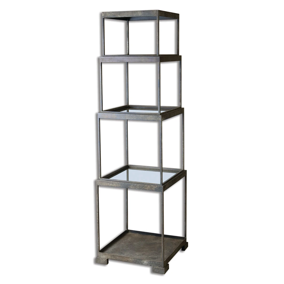 Four Rustic Bronze Metal Stacked Cubes With Antiqued Mirror Shelves.