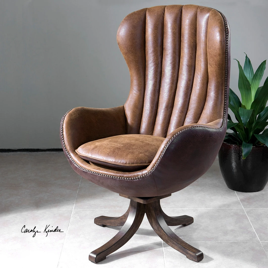 With A Nod To The Mid-century Design Classic, This Toffee Brown Faux Sueded Chair Gives New Attention To Transitional Details Through Its Deep-grained Chestnut Brown, Splayed Hardwood Swivel Base, Channel Tufted Back Adding Superior Comfort And Individually Hammered, Antique Brass Accent Nails. Reversible Seat Cushion And Surrounding Back Feature Darker Brown Faux Leather. Seat Height Is 21″.