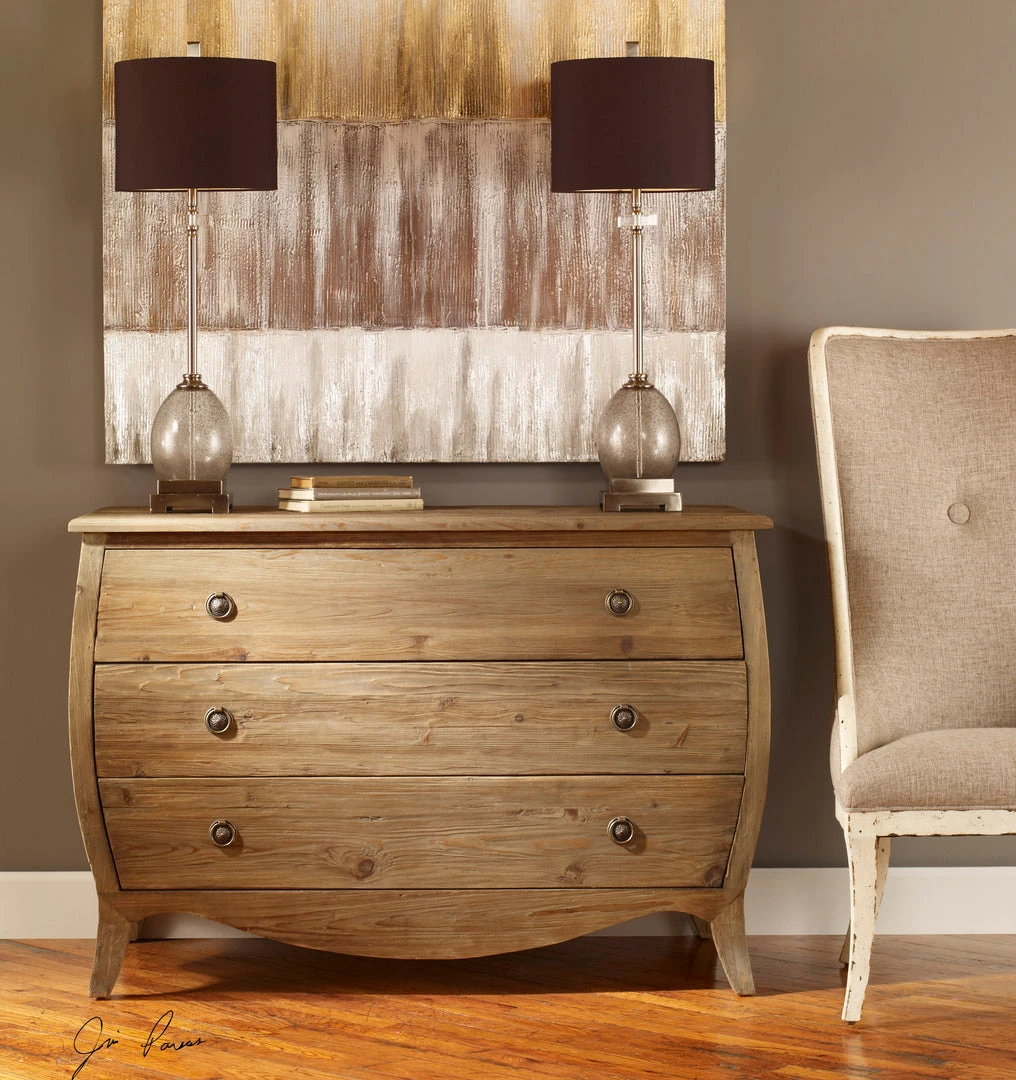 Lightly Burnished Pine With A Gray Wash, Set In A Curved Bombe Frame With Dark Antique Brass, Empire Style Ring Pull Hardware.