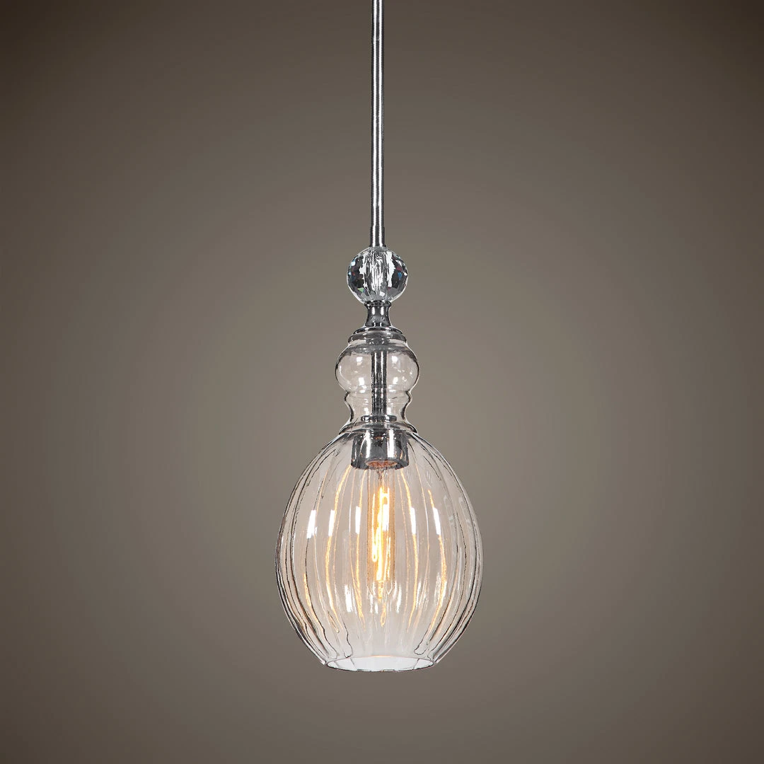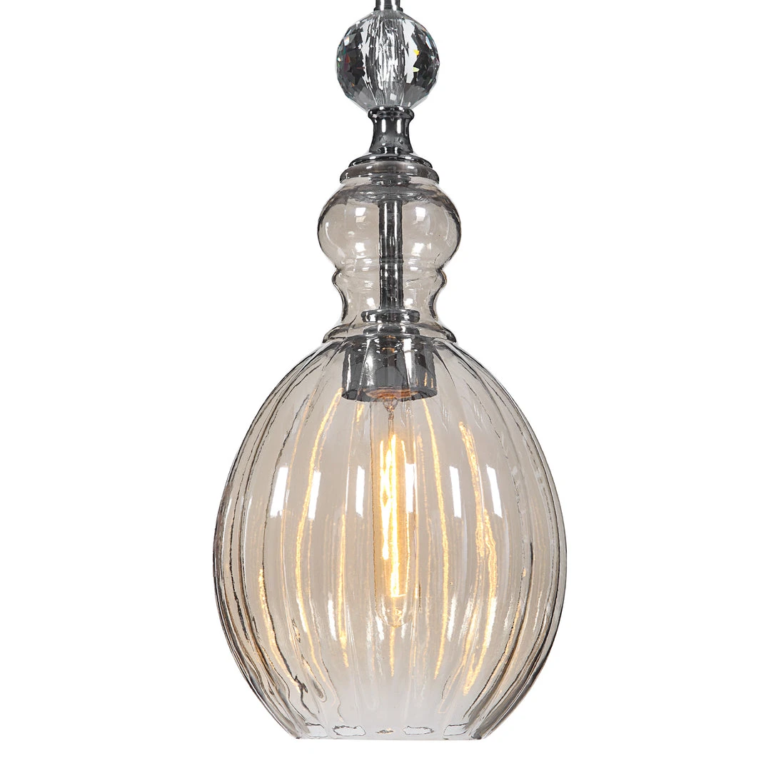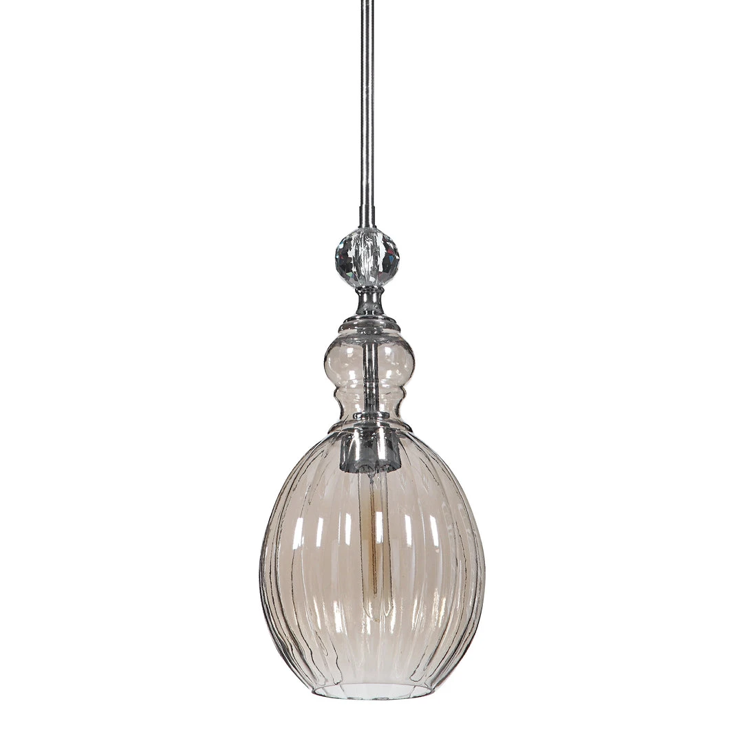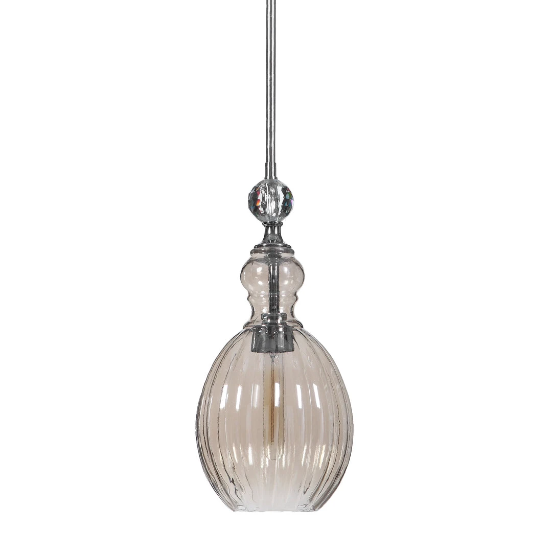 A Softly Feminine With Cognac Plated Glass And A Crystal Ball Accent, This 1 Lt. Mini Pendant Charms With Elegance. 1-60 Watt Max Edison Socket. Includes 1-40 Watt Clear T30 Antique Style Bulb. Supplied With 15 Wire, And 3-12″ Stems & 1-6″ Stem For Adjustable Installation.