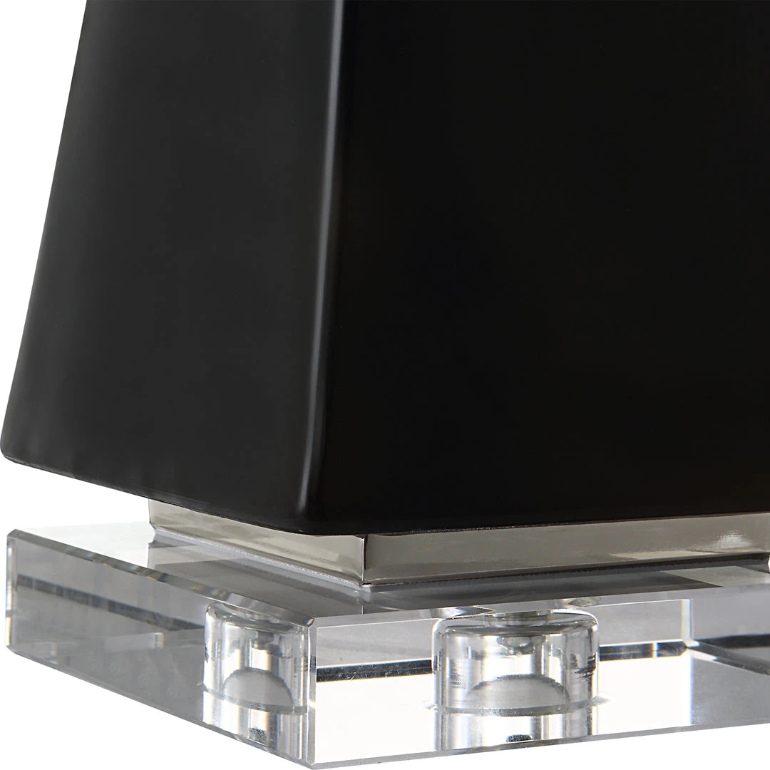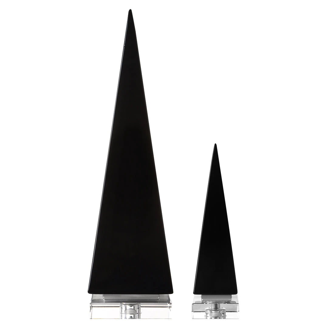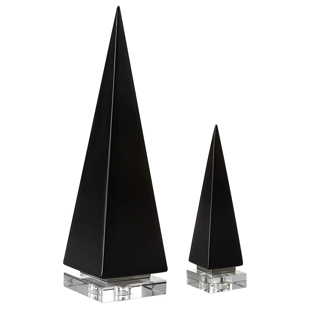 Set Of Two Ceramic Pyramid Sculptures Are Finished In A Gloss Black Glaze, Accented By Polished Nickel Plated Bands And Elegant Crystal Feet. Sizes: S-3x10x3, L-5x19x5