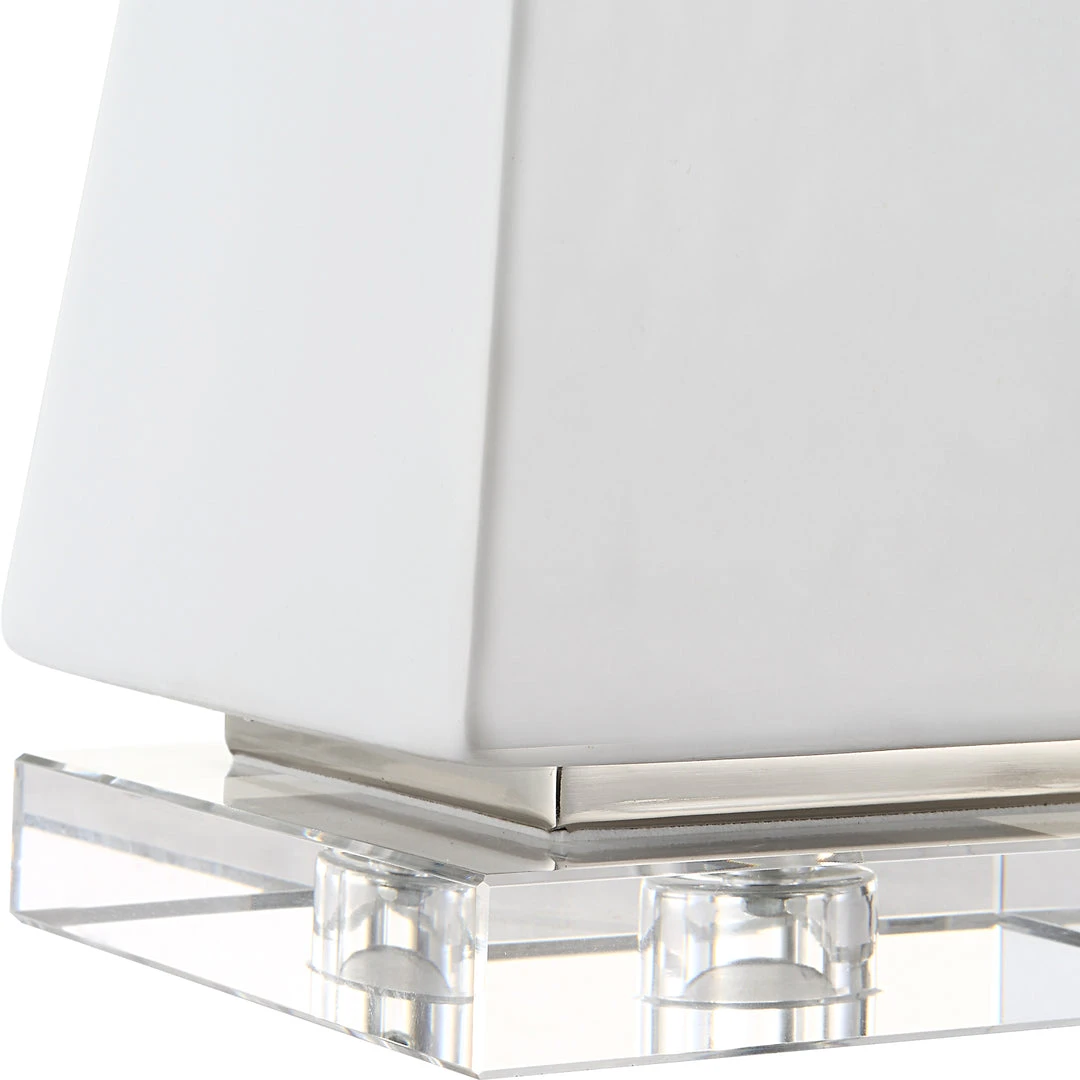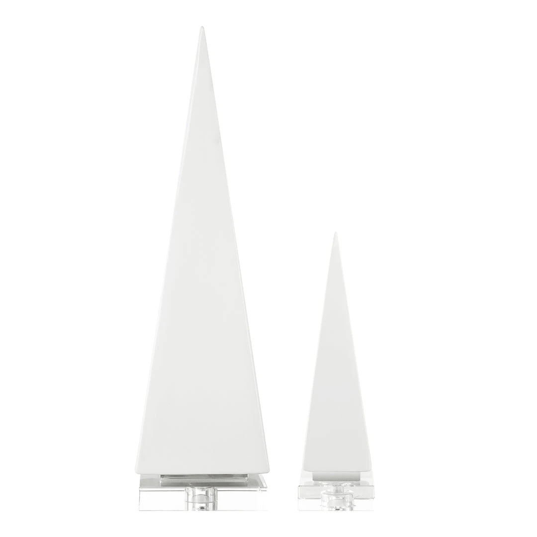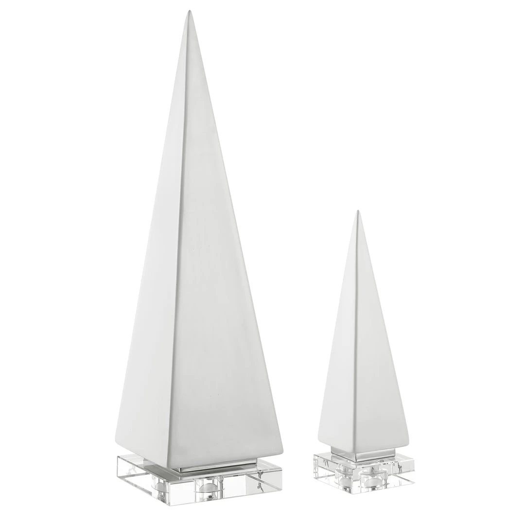 Set Of Two Ceramic Pyramid Sculptures Are Finished In A Gloss White Glaze, Accented By Polished Nickel Plated Bands And Elegant Crystal Feet. Sizes: S-3x10x3, L-5x19x5