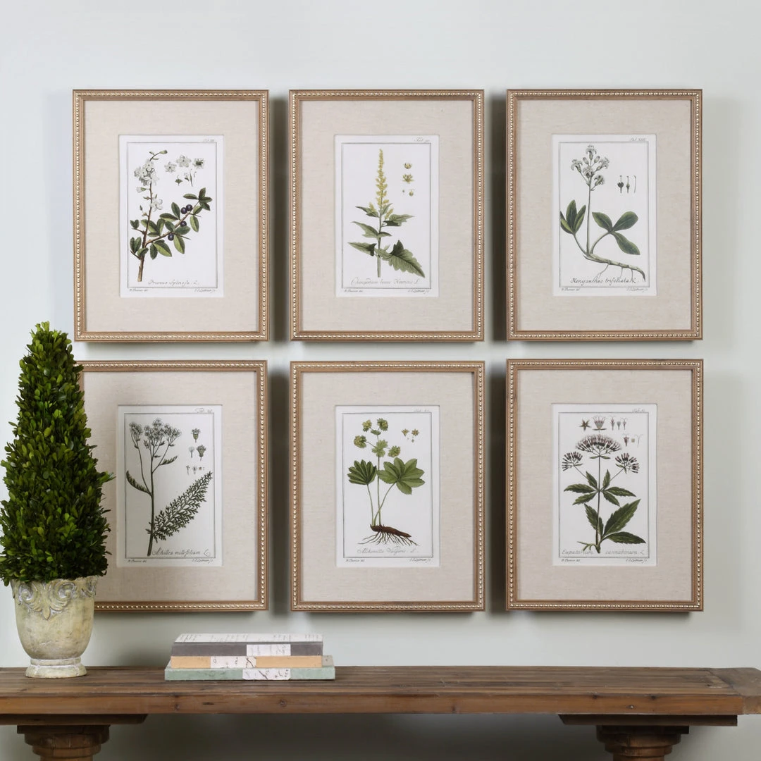 Traditional In Style, These Classic Botanical Prints Bring A Timeless Elegance To A Space. Each Print Is Accented By A Textured, Linen Mat. A Distressed Wooden Frame Finished In Gold Leaf And Accented With Gold Beads Completes Each Piece Of Artwork. Each Print Is Placed Under Protective Glass.