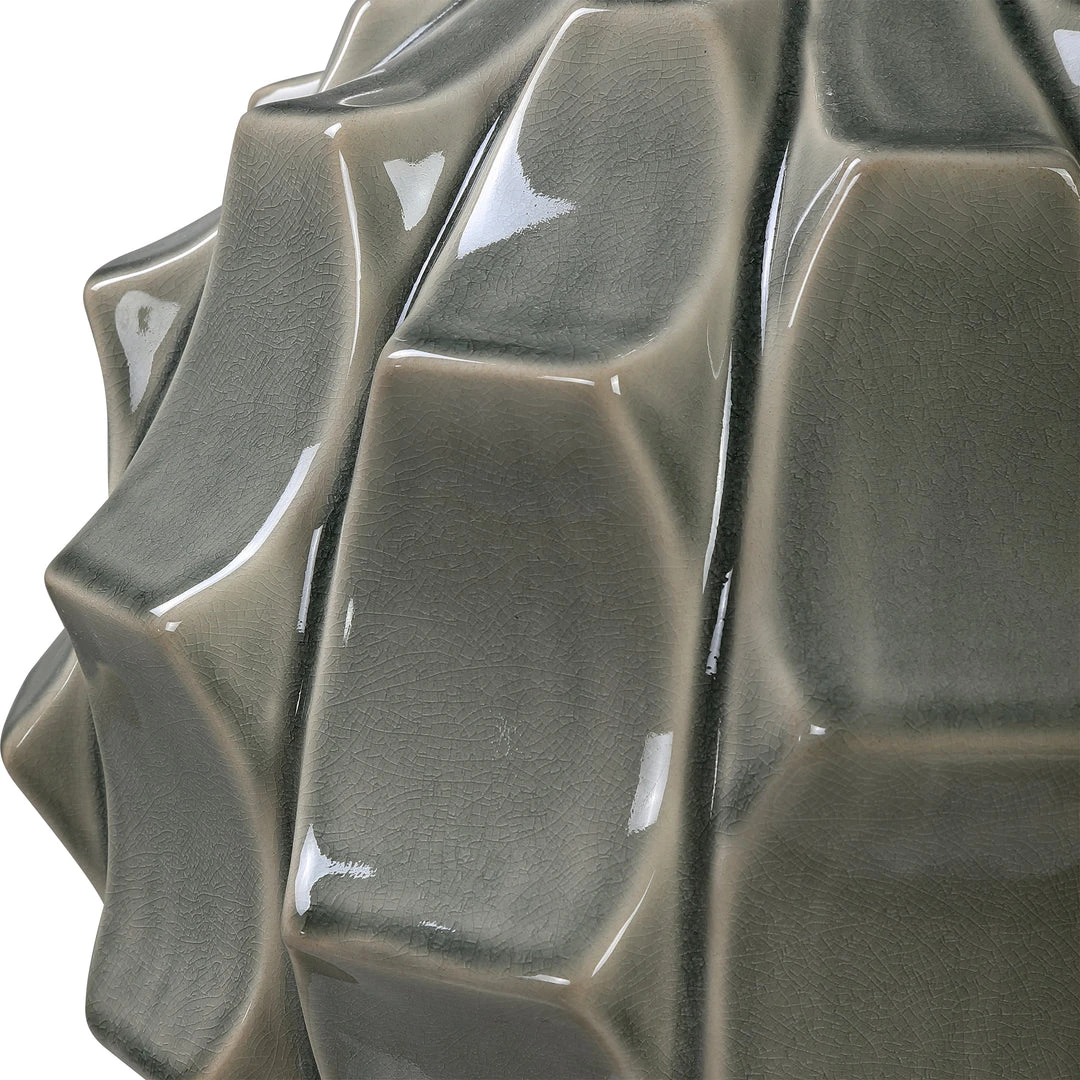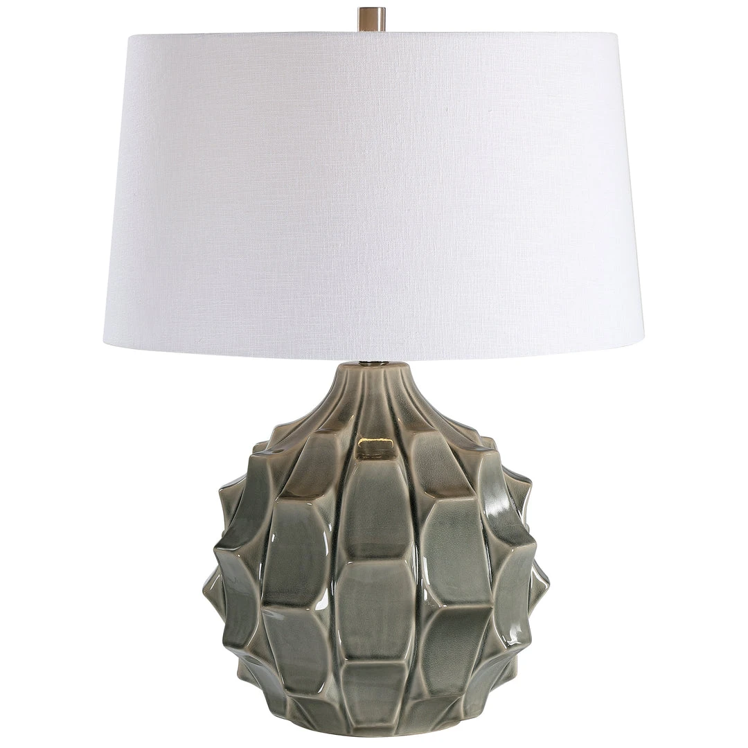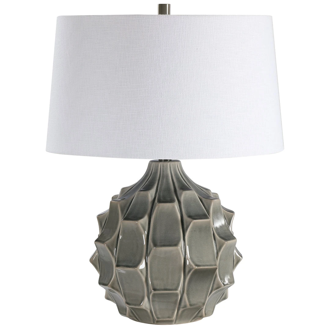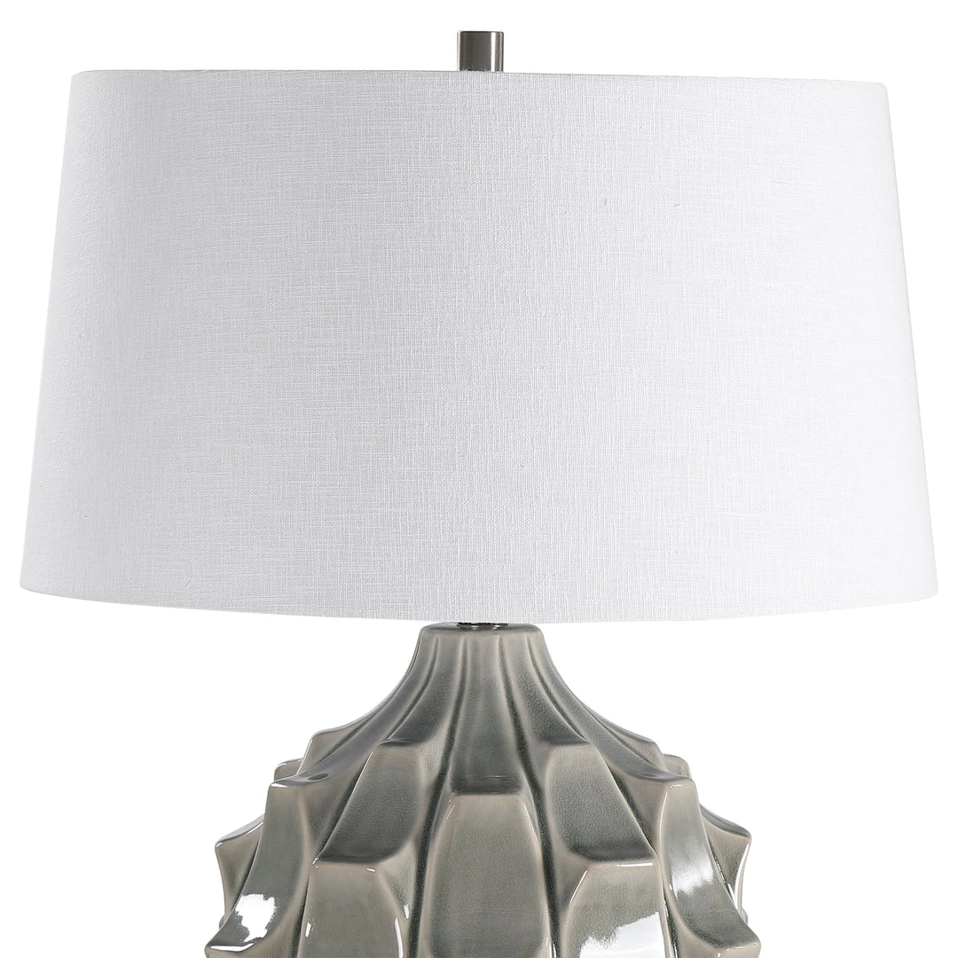 Scalloped Ceramic Base Is Finished In A Light Gray Glaze With Ivory Rub-through Details And Is Accented With Plated Brushed Nickel Details. The Round Tapered Hardback Shade Is A White Linen Fabric With Natural Slubbing.
