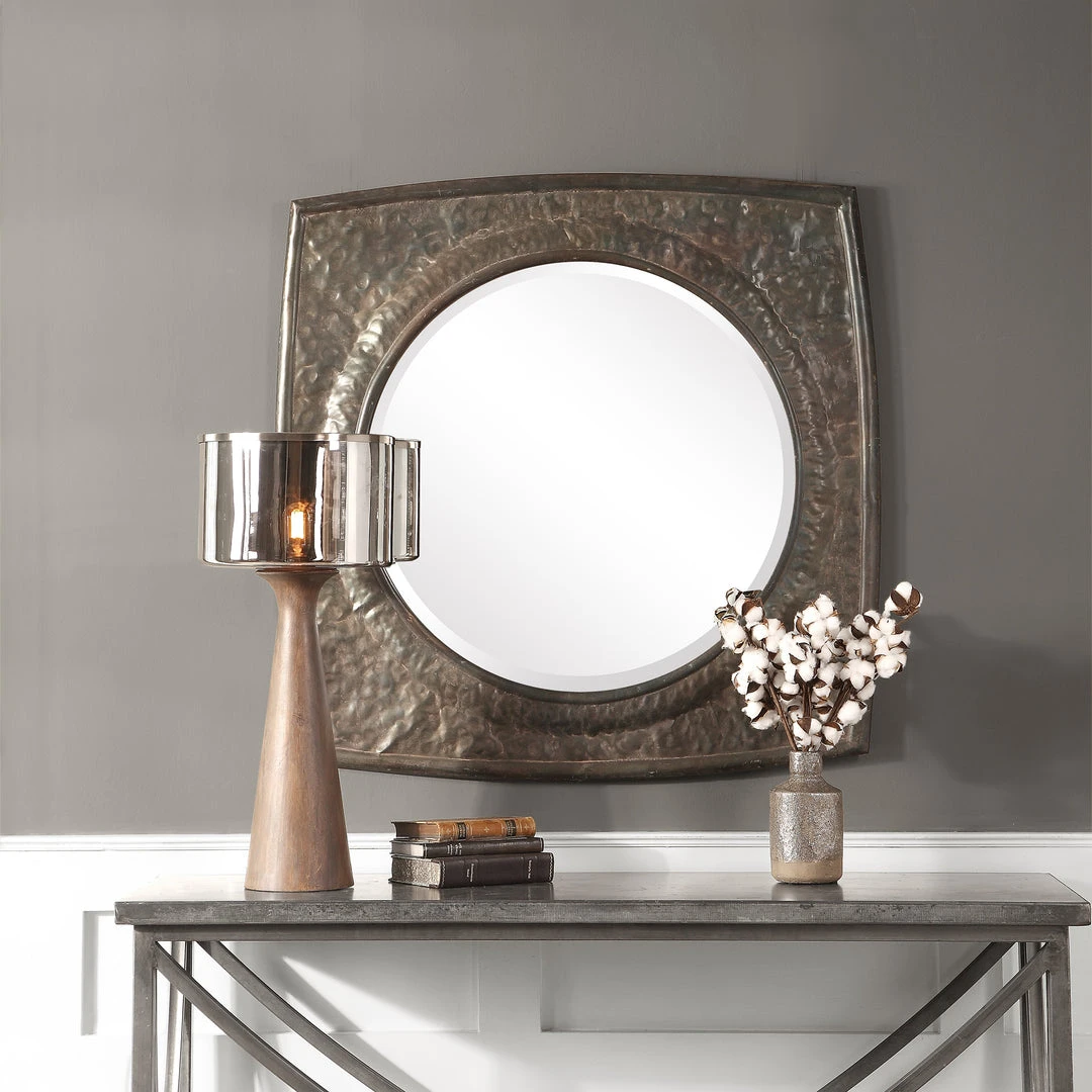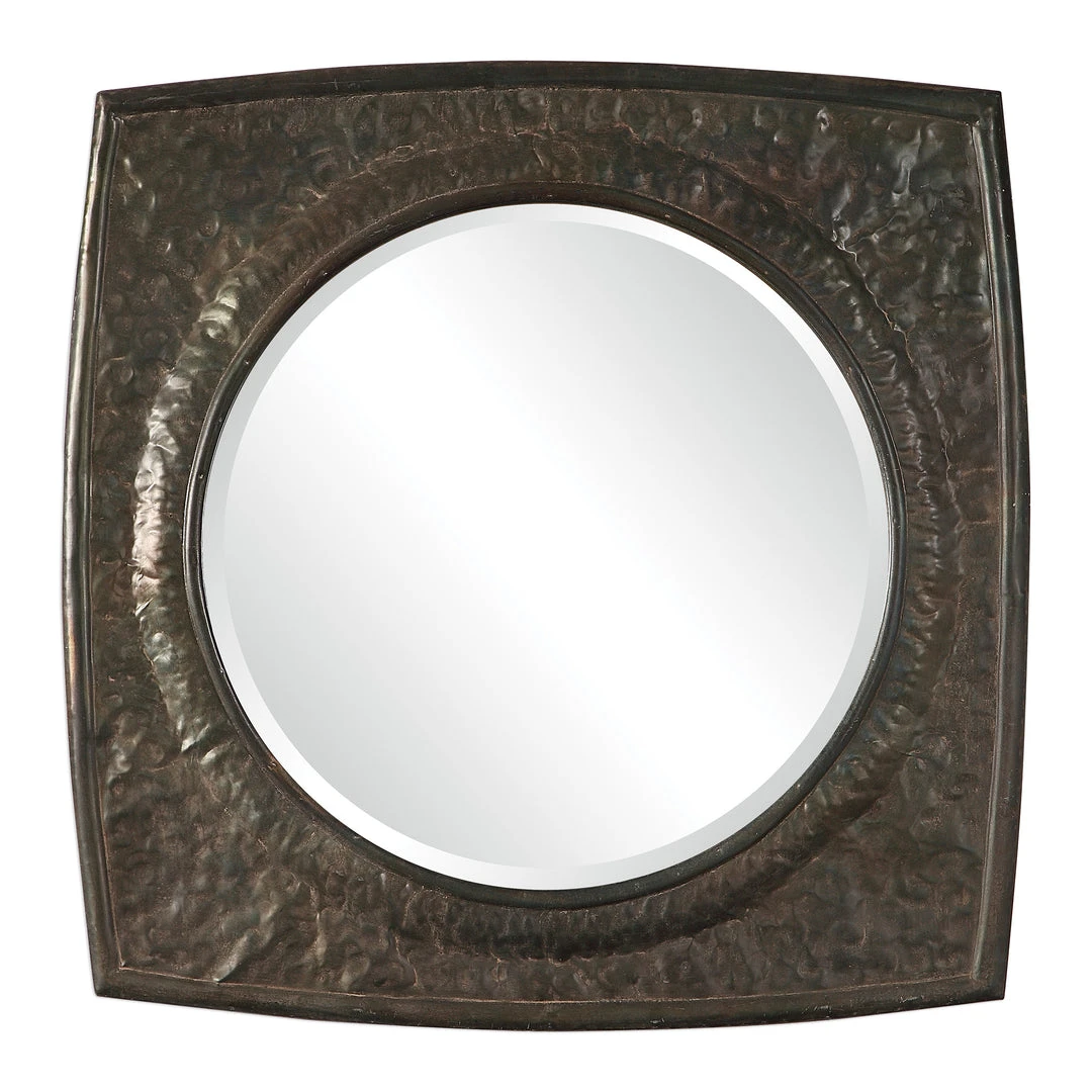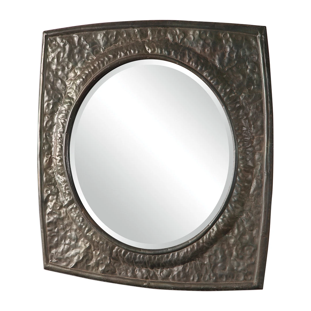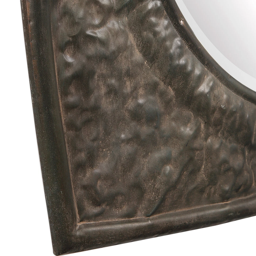 This Iron Frame Features A Crudely Hammered Texture, With Rounded Edges That Are Subtle Curved For A Design Uniqueness, Hand Finished In An Aged Black With A Rust Taupe Wash. Mirror Features A Generous 1 1/4″ Bevel.