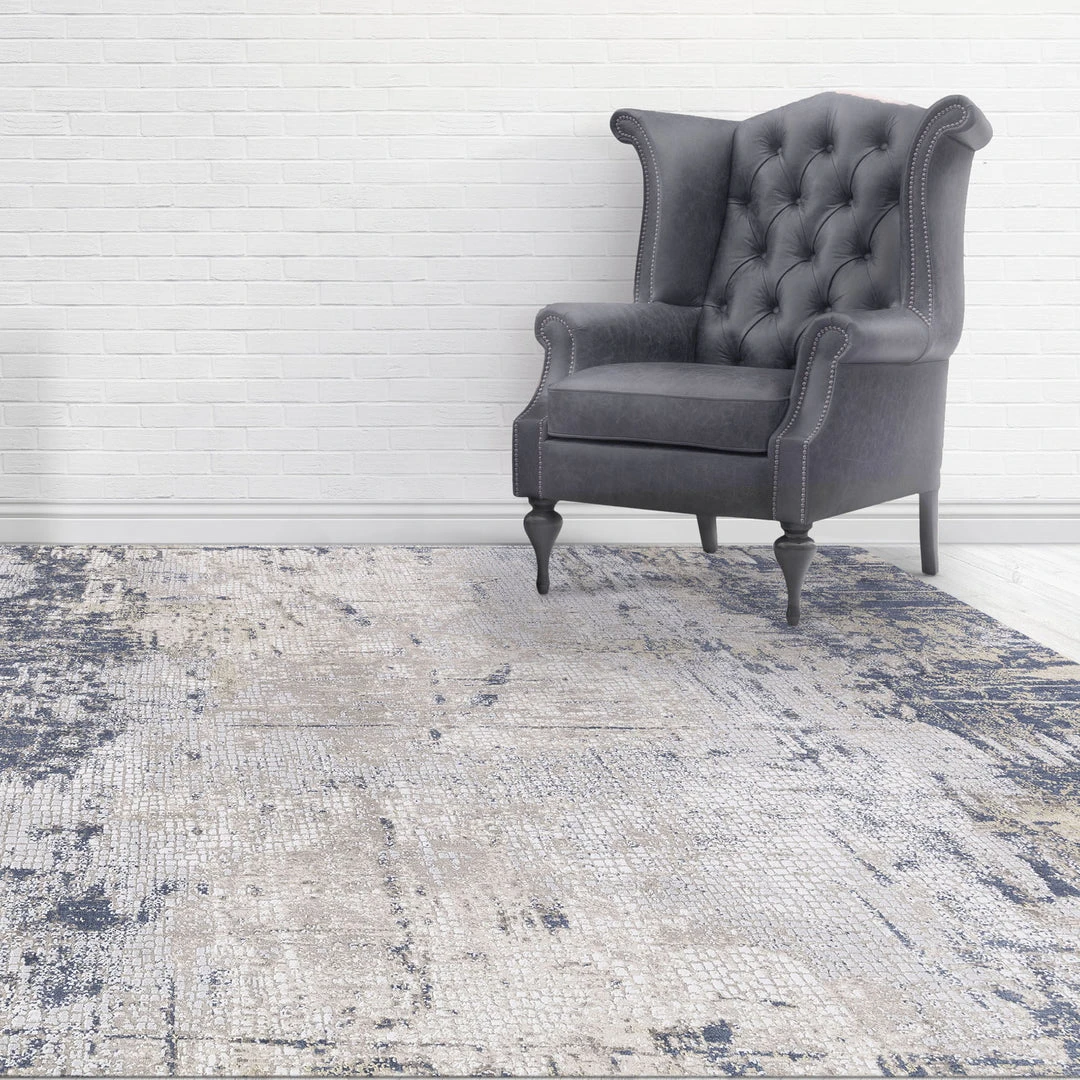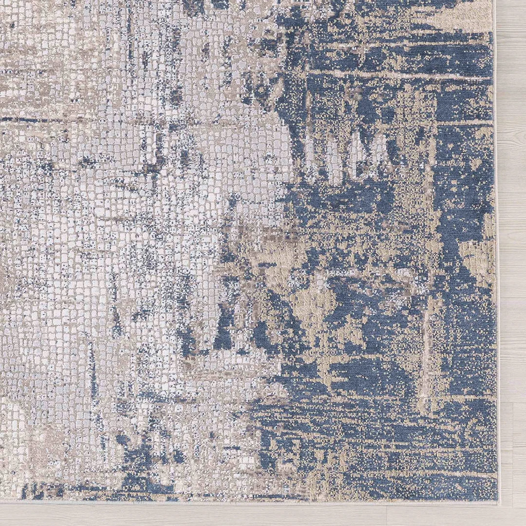 This power loomed rug features an abstract design in tones of beige and light gray, with indigo blue detailing, constructed from a mix of polyester and viscose for a soft to the touch feel.