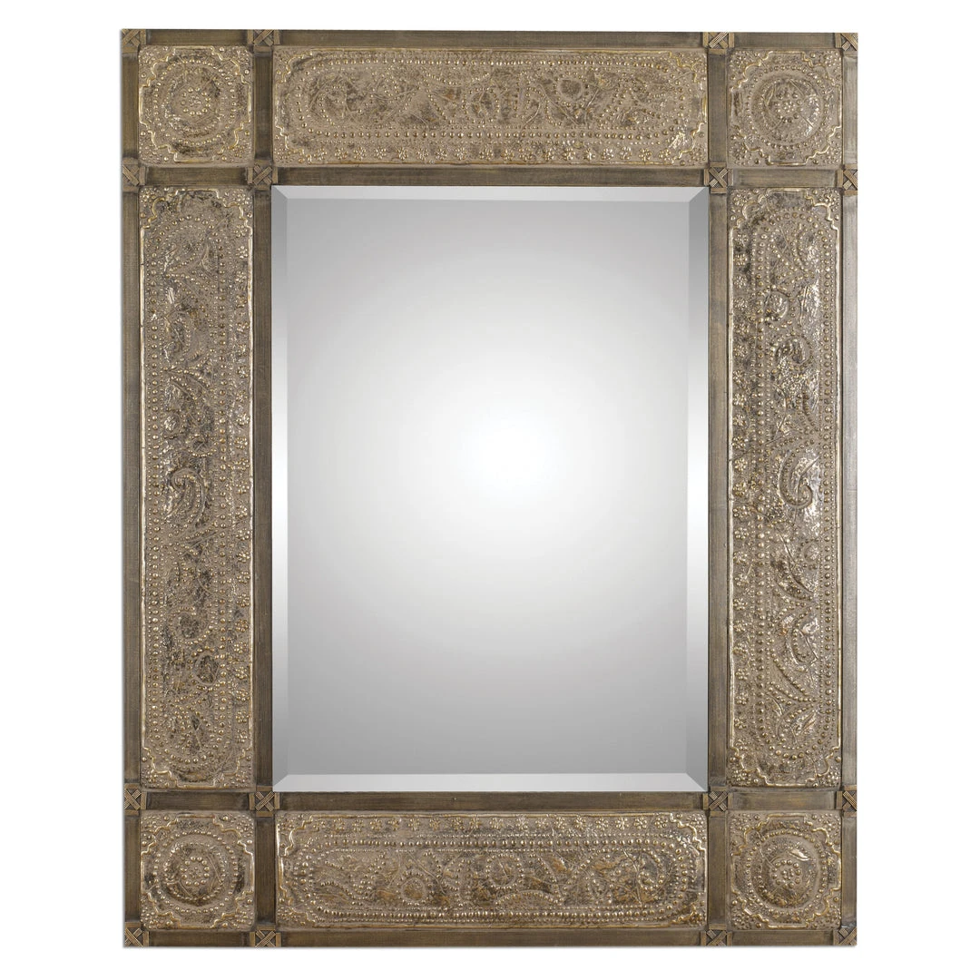 This Ornate Frame Features Heavily Distressed, Golden Champagne Leaf With Black Undertones, Deep Red Dry Brushing And A Heavy, Rusty Tan Wash. Mirror Has A Generous 1 1/4″ Bevel. May Be Hung Either Horizontal Or Vertical.