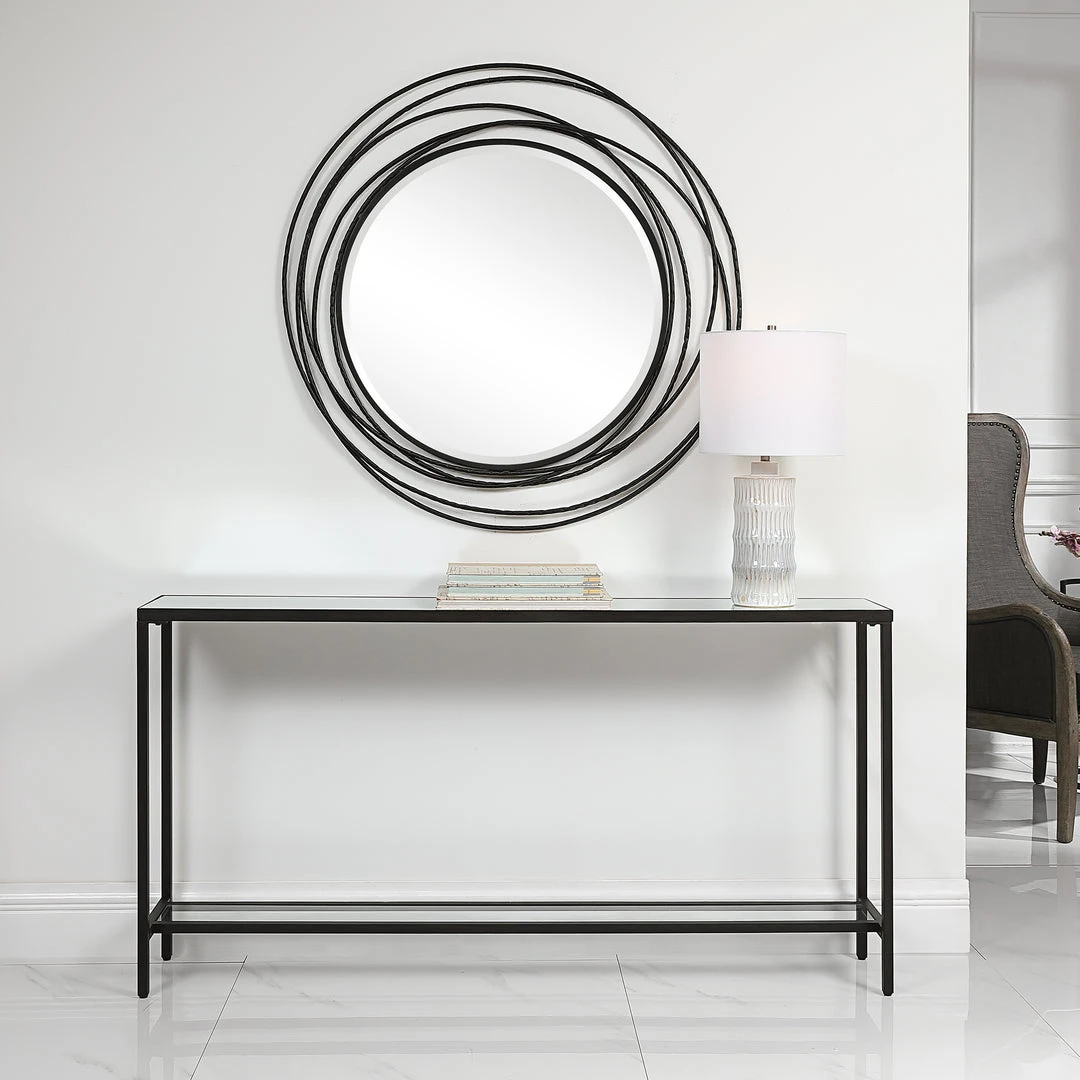 Classic And Minimalistic, This Narrow Console Table In Steel Is Finished With A Streamlined Matte Black, Inset With A Beveled Mirrored Top, And Gallery Shelf In Clear Glass.