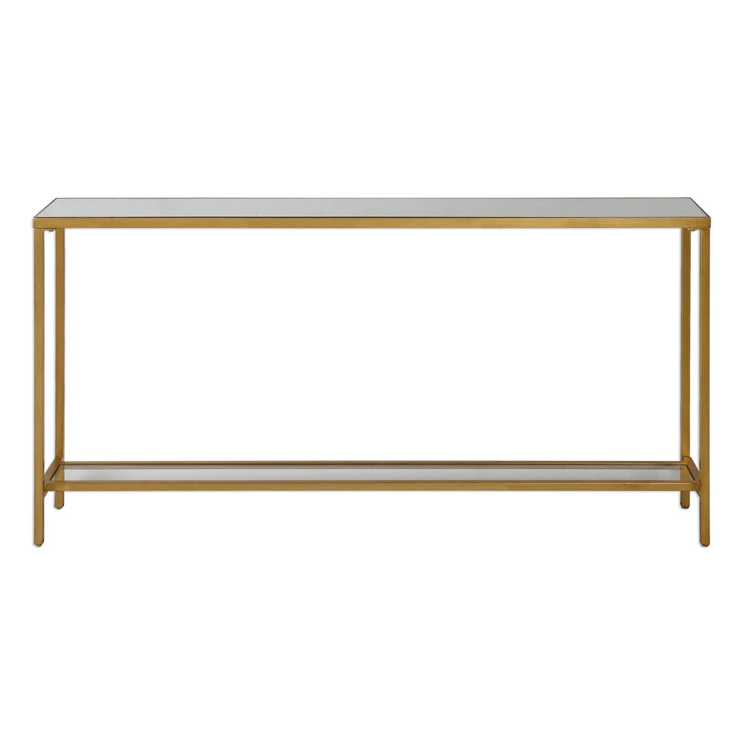 Classic And Minimalistic, This Narrow Console Table In Iron Is Finished With Lightly Antiqued Gold Leaf, Inset With A Beveled Mirrored Top, And Gallery Shelf In Clear Glass.