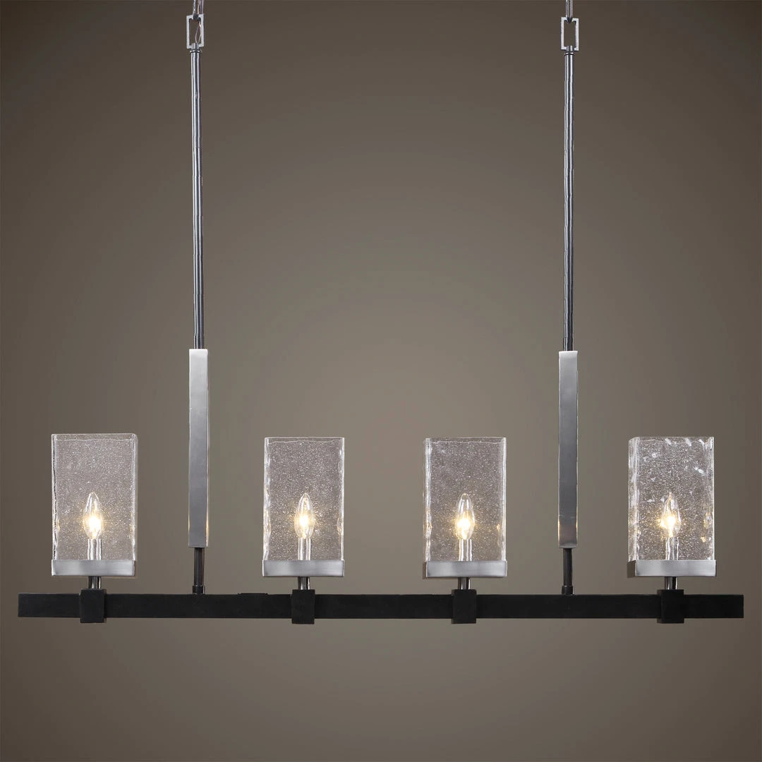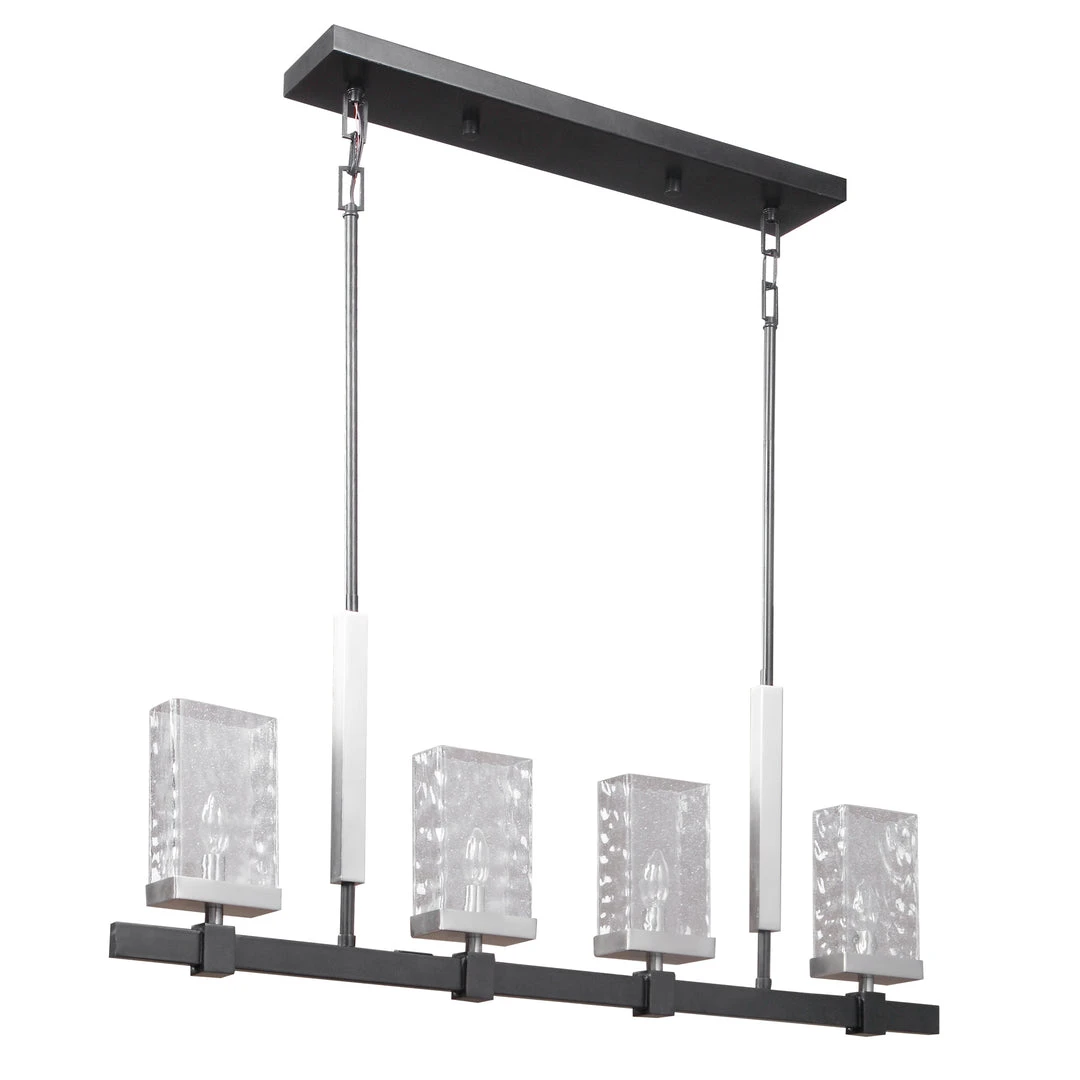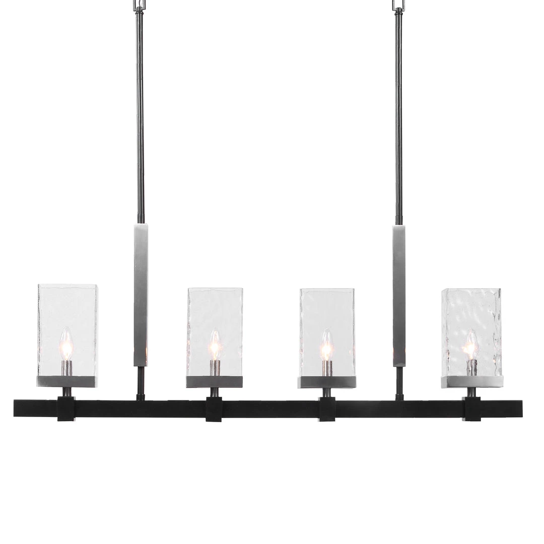 Clean Transitional 4 Lt. Island With A Textured Black Finish & Brushed Nickel Accents, Featuring Unique Rectangular Clear Watered And Micro Seeded Glass. With 4-60 Watt Max Candelabra Sockets And Also Includes 20 Wire, And 6-12″ Stems & 2-6″ Stem For Adjustable Installation.