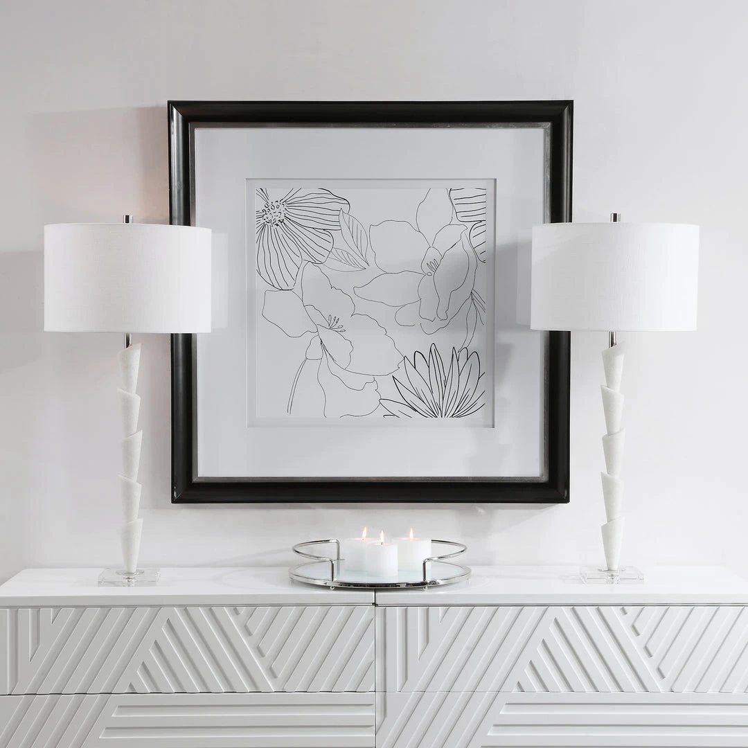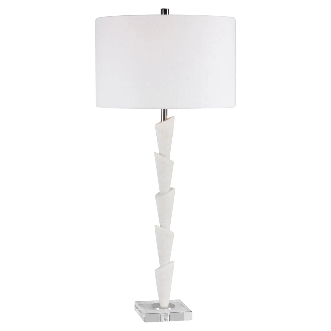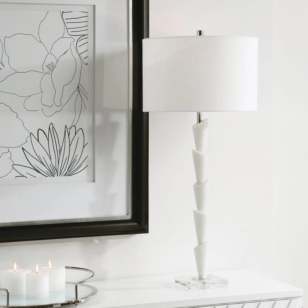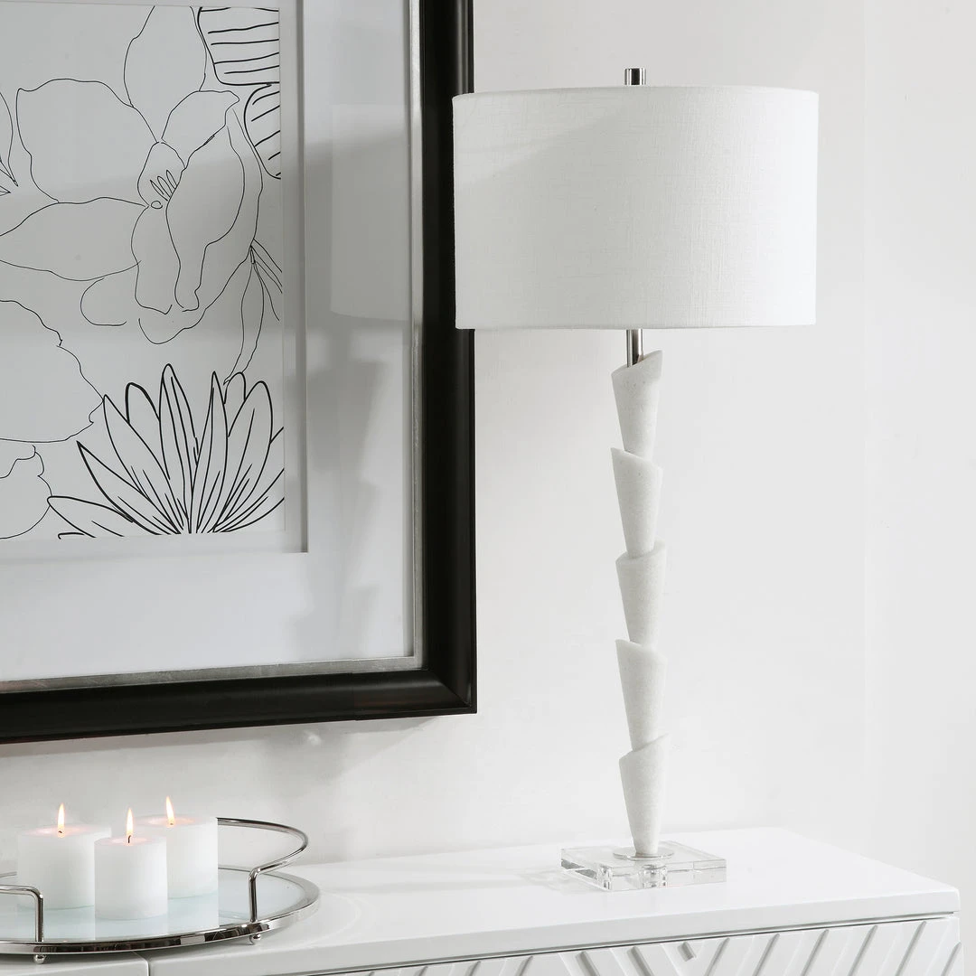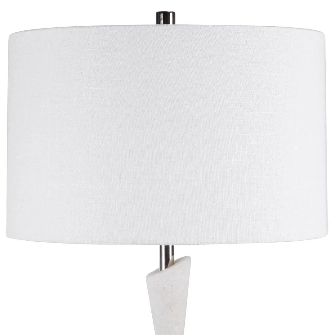 Showcasing A Granulated Marble That Accurately Replicates The Look Of Thassos Marble, This Table Lamp Evokes A Modern Sophisticated Style With White And Light Gray Tones That Are Accented With A Thick Crystal Foot And Polished Nickel Plated Details. The Lamp Is Paired With A Round Hardback Drum Shade In A White Linen Fabric.