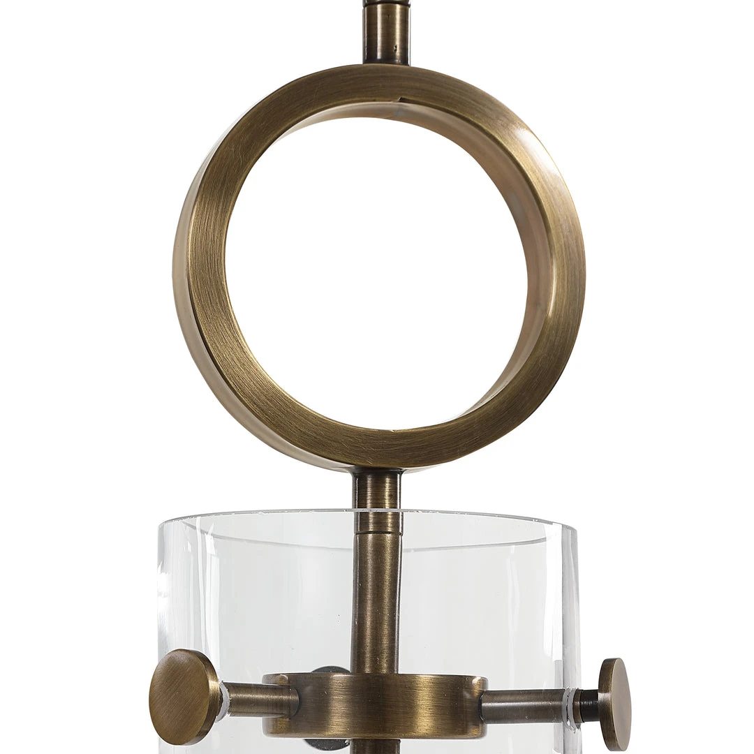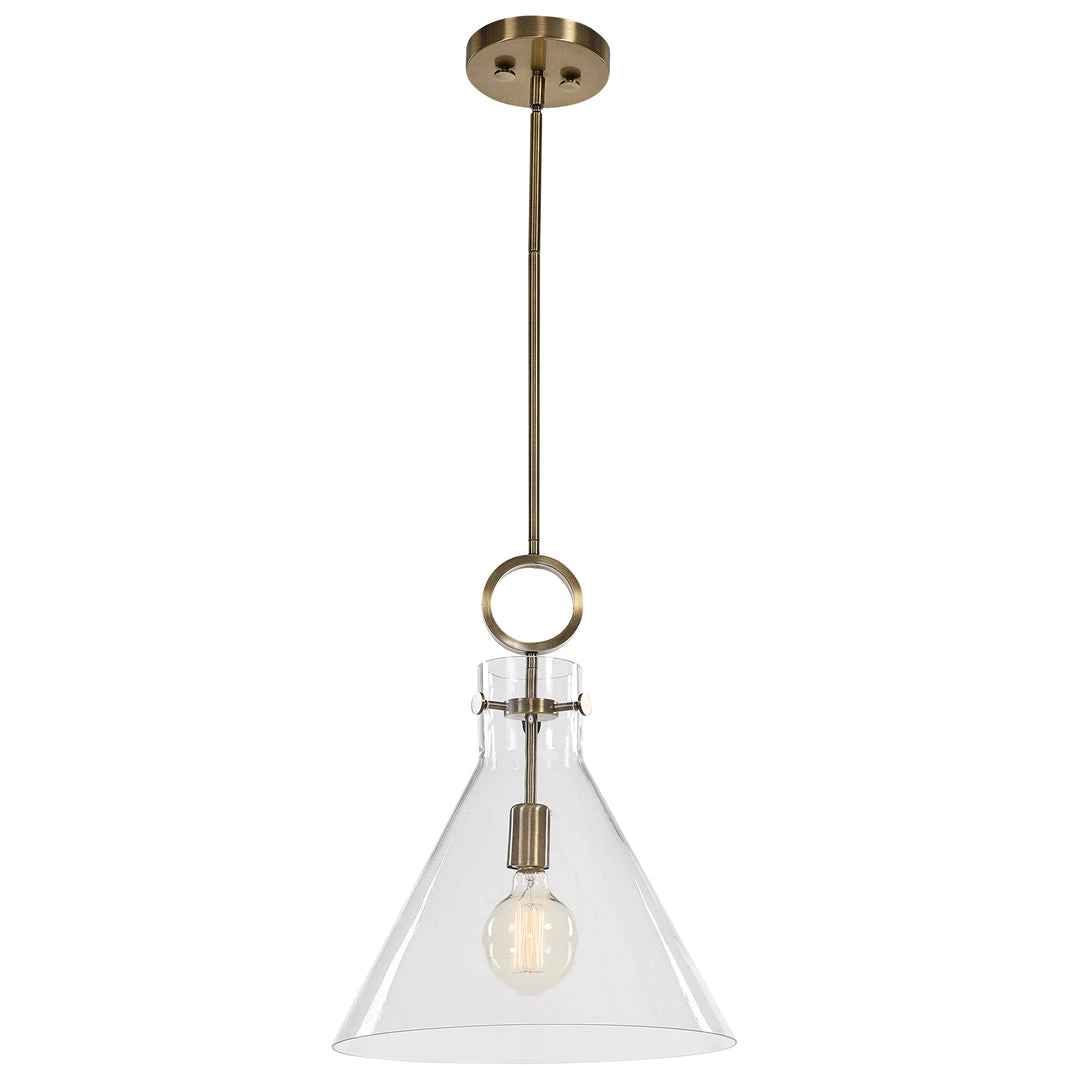 Playful Funnel Shaped Clear Glass Bestows An Almost Whimsical Touch To The Clean Design Of This 1 Lt. Pendant With Aged Brass Strengthening The Modern Line. With 1-100 Watt Max, Edison Socket And Includes 15 Wire, 3-12″ Stems And 1-6″ Stem For Adjustable Installation.