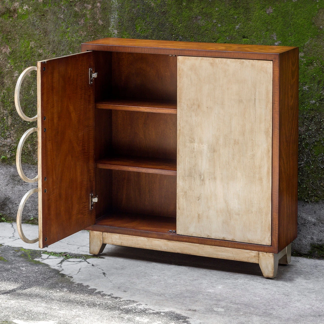 Craftsman Built Of Select Hardwoods In A Dark Honey Frame, With Silver Leaf Doors In A Light Antique Stain, Featuring Three Iron Ring Door Pulls. Two Adjustable Interior Shelves.