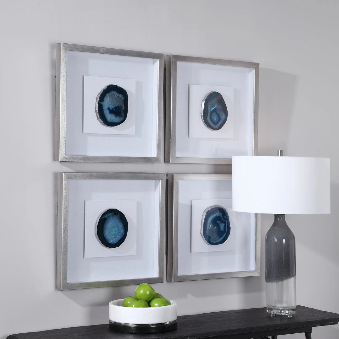 A pine wood shadow box featuring a hand applied silver leaf finish showcases a striking blue agate stone with light blue veining, accented with hand painted silver edging. Mounted on a white linen backing.