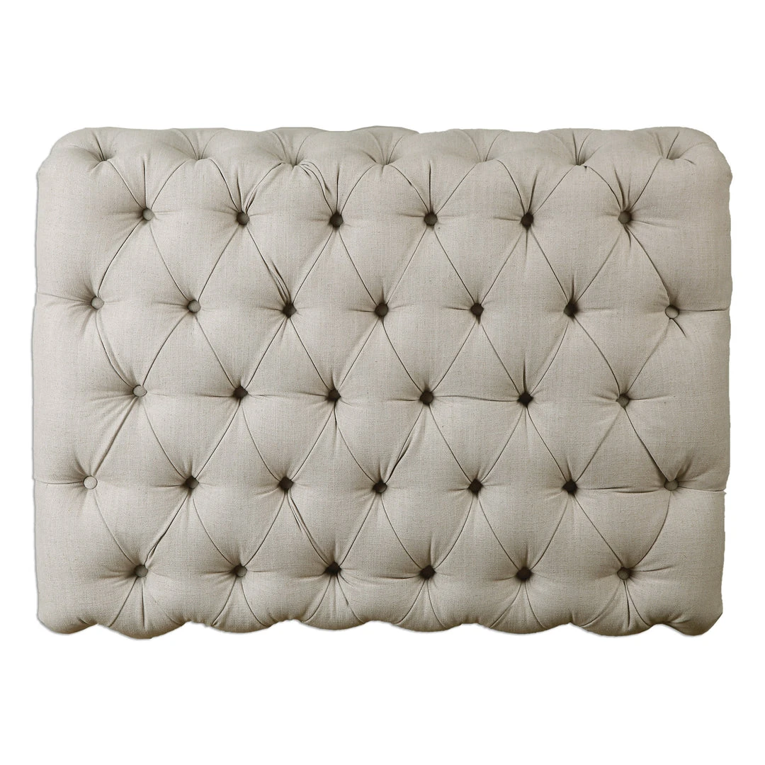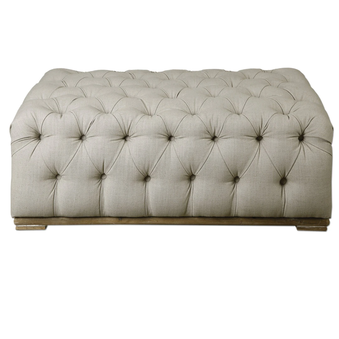 Plush Ottoman Features Diamond Button Tufts In An Antique White Linen On An Oak Base With A Light Gray Wash.