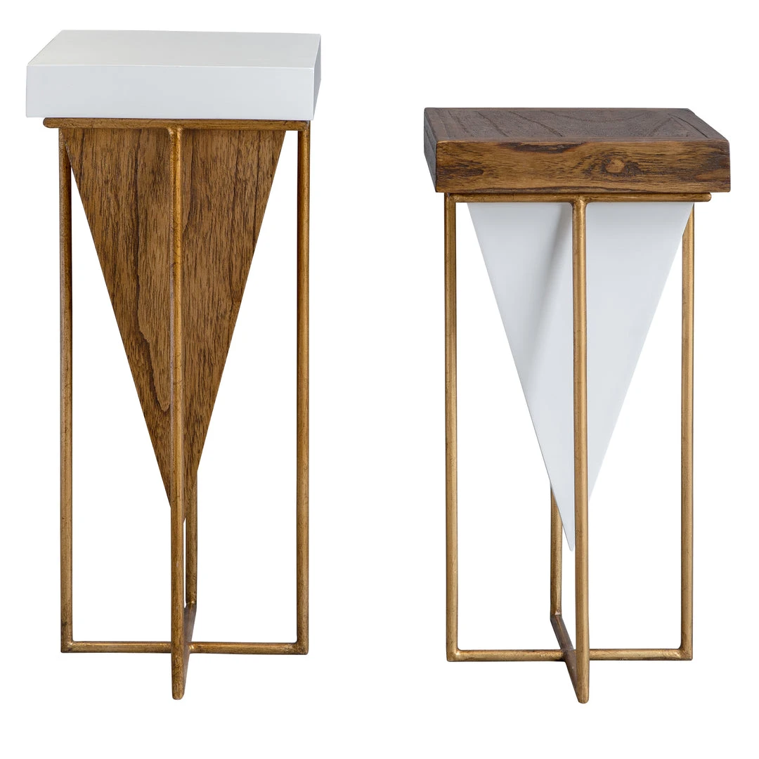 Scandinavian Inspired, This Set Of 2 Accent Tables Is Finished In Alternating Gloss White And Walnut Finished Mini Veneer Atop Antique Gold Finished Bases.