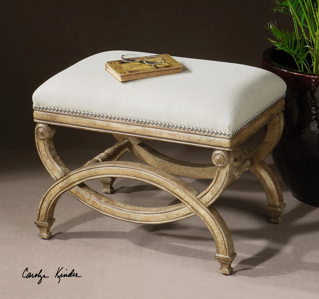 Hand Carved, White Mahogany Frame With Antiqued Almond Finish. Covering Is Natural Linen And Cotton With Stain Resistant Fabric Protector Accented By Champagne Silver Nails.