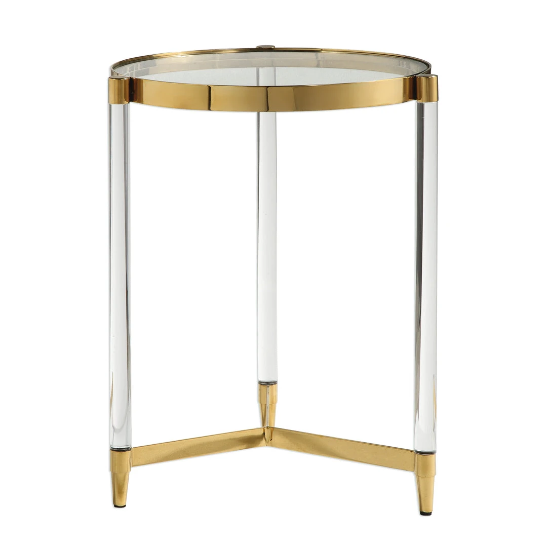 A True Glam Accent, Featuring A Gold Plated Stainless Steel Frame With Clear Glass, Acrylic Legs And Tapered Feet.