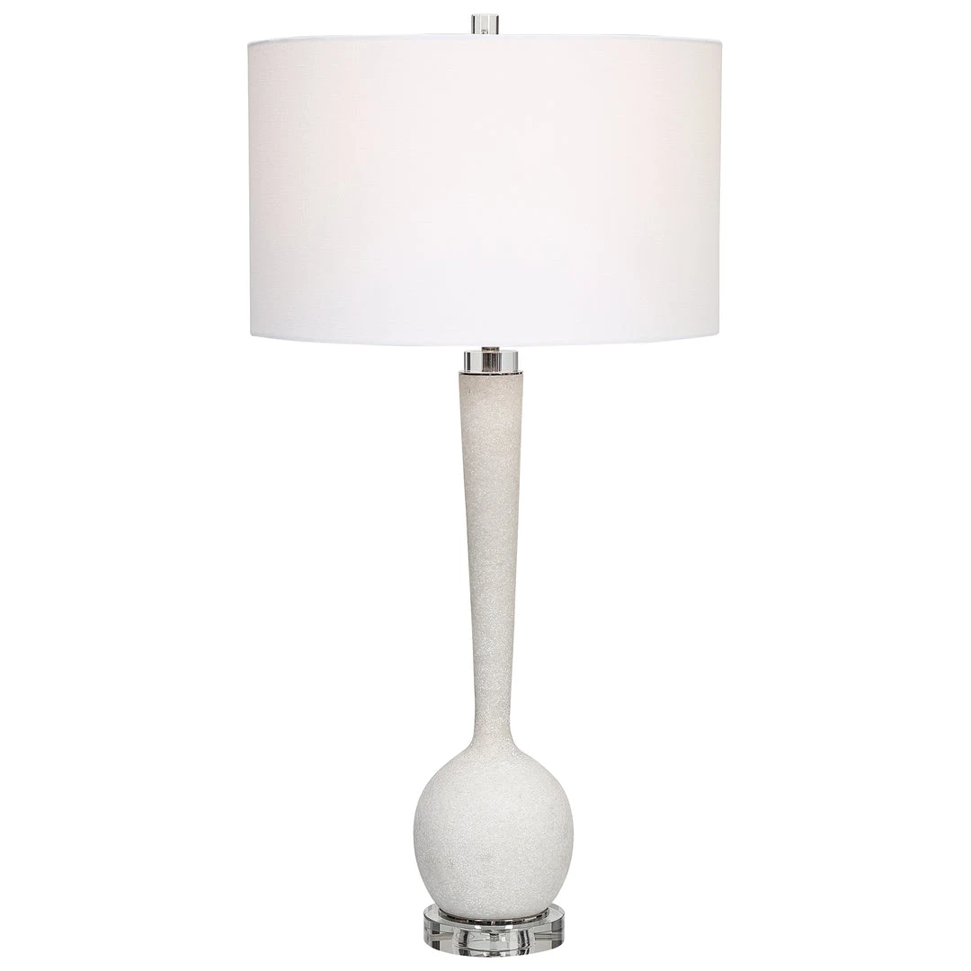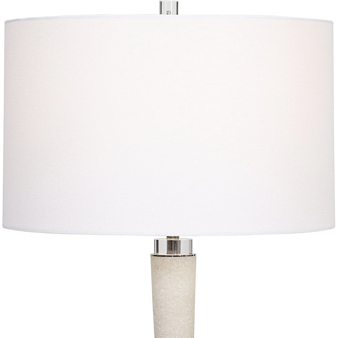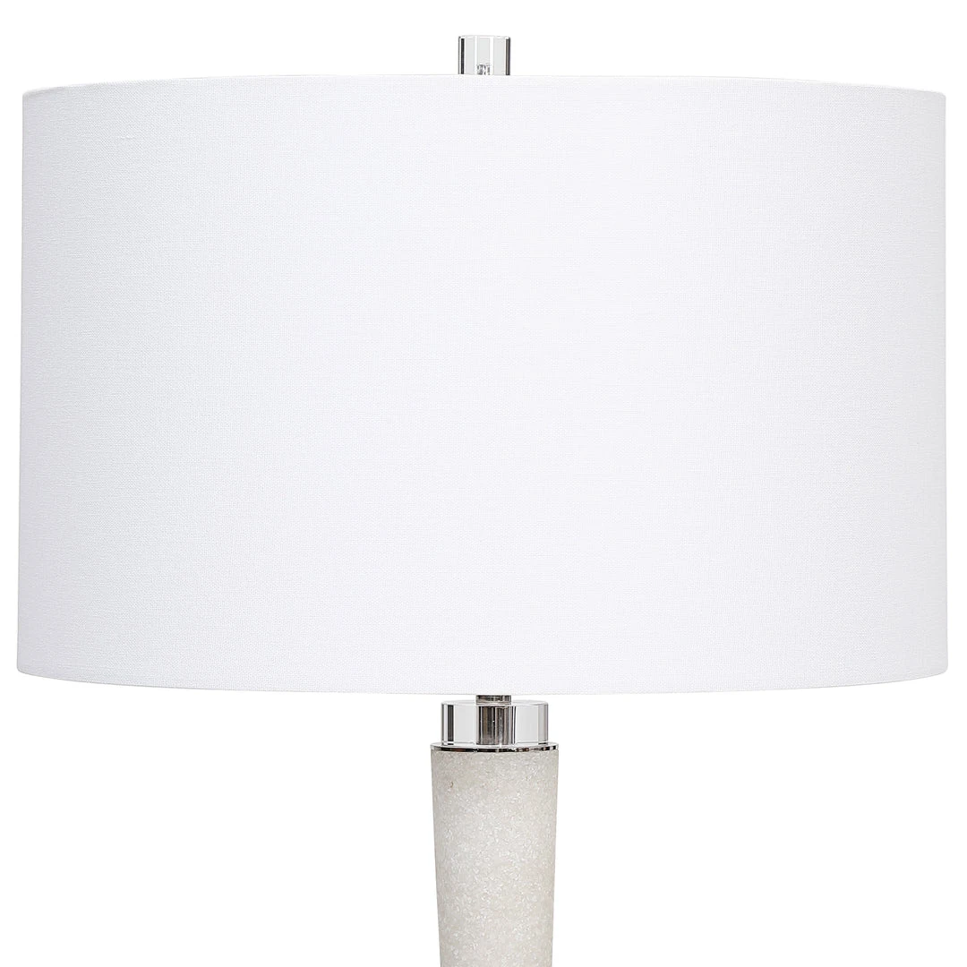 This Elegant Table Lamp Is Executed In A Rich Looking Material Made Of Granulated White Marble That Accurately Replicates The Look Of Thassos Marble, Accented By Thick Crystal Details. A White Hardback Drum Shade Completes The Lamp.