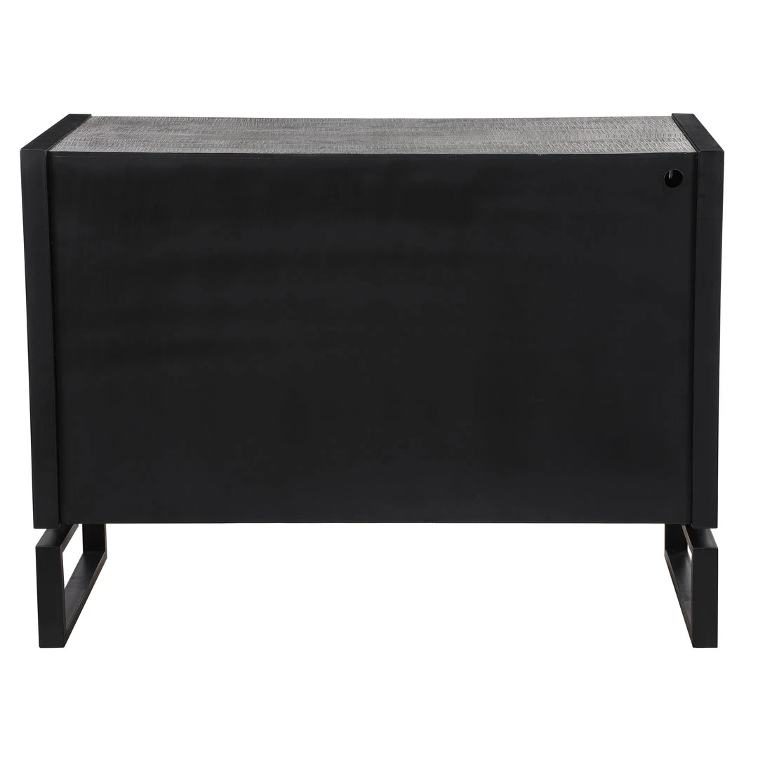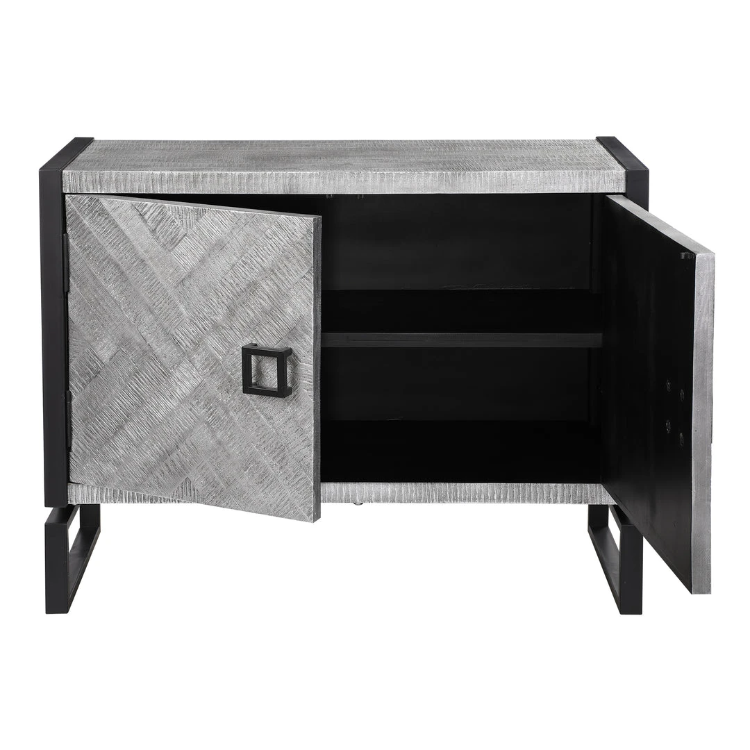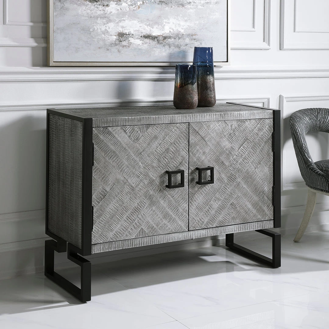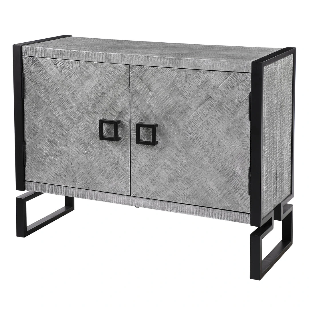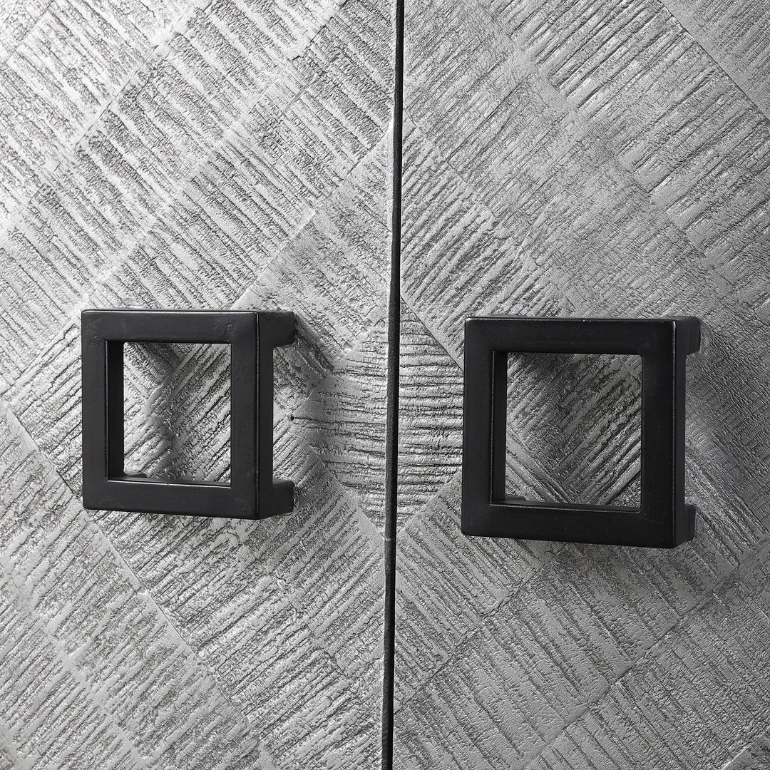 Showcasing Ties To Bohemian And Global Styles, This Versatile Two Door Cabinet Features A Chiseled Herringbone Pattern In Light Gray And Charcoal Finished Pine Wood With Silver Leaf Highlights, And Accented With Matte Black Iron Hardware And Framework Details. The Charcoal Finished Interior Contains Two Fixed Shelves.