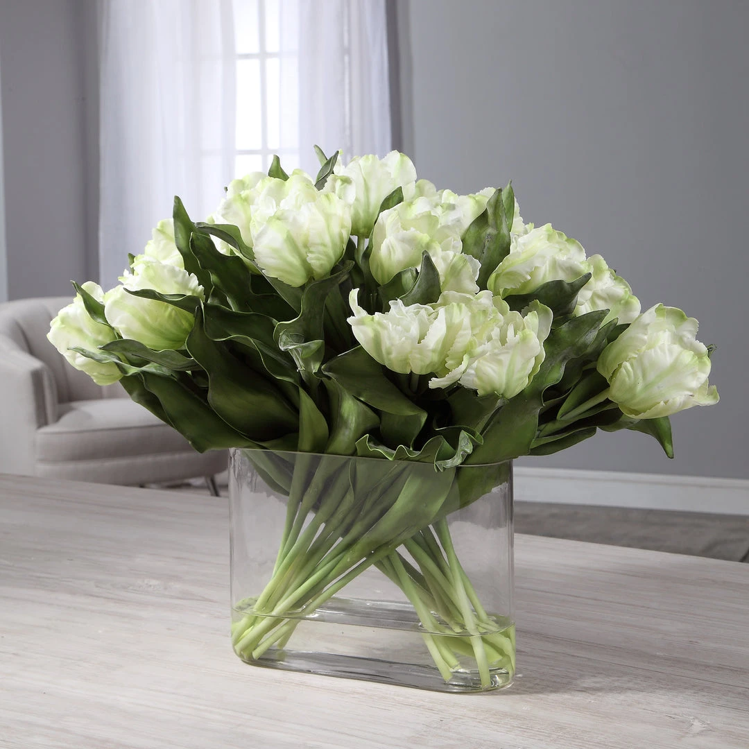 Featuring A Dramatic Spread Of White Tulips, Meticulously Placed Into An Oval Glass Vase Complete With Faux Water.