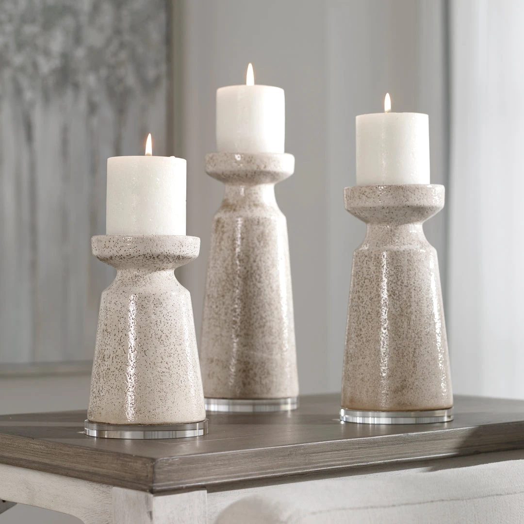 Set Of Three Candleholders Feature A Lightly Textured Ceramic With Crackled Glaze Finished In An Ombre, Light Antique Sand With Crystal Bases. Three, 3″x 3″ Off-white Distressed Candles Included. Sizes: S-5x7x5, M-5x9x5, L-5x11x5