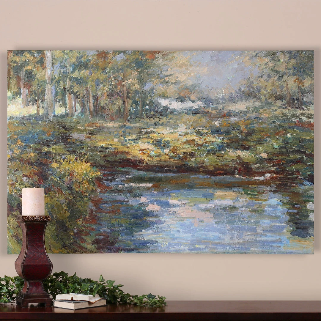 Reminiscent Of Impressionist-style Artwork, This Hand Painted Oil On Canvas Showcases A Timeless, Landscape Design. The Frameless Piece Is Awash In Blue, Green, White, And Bronze Tones. The Canvas Is Stretched And Attached To Wood Stretching Bars. Due To The Handcrafted Nature Of This Artwork, Each Piece May Have Subtle Differences.