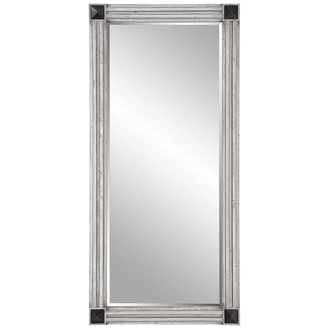 This Oversized Mirror Exudes A Stately Feel With Rustic Character. The Frame Is Crafted From Solid Fir Wood Finished In A Heavily Distressed White Wash With Gray Undertones. Aged Dark Bronze Accents With Nail Details Adorn Each Corner. Mirror Has A 1 1/4″ Bevel And May Be Hung Horizontal Or Vertical.