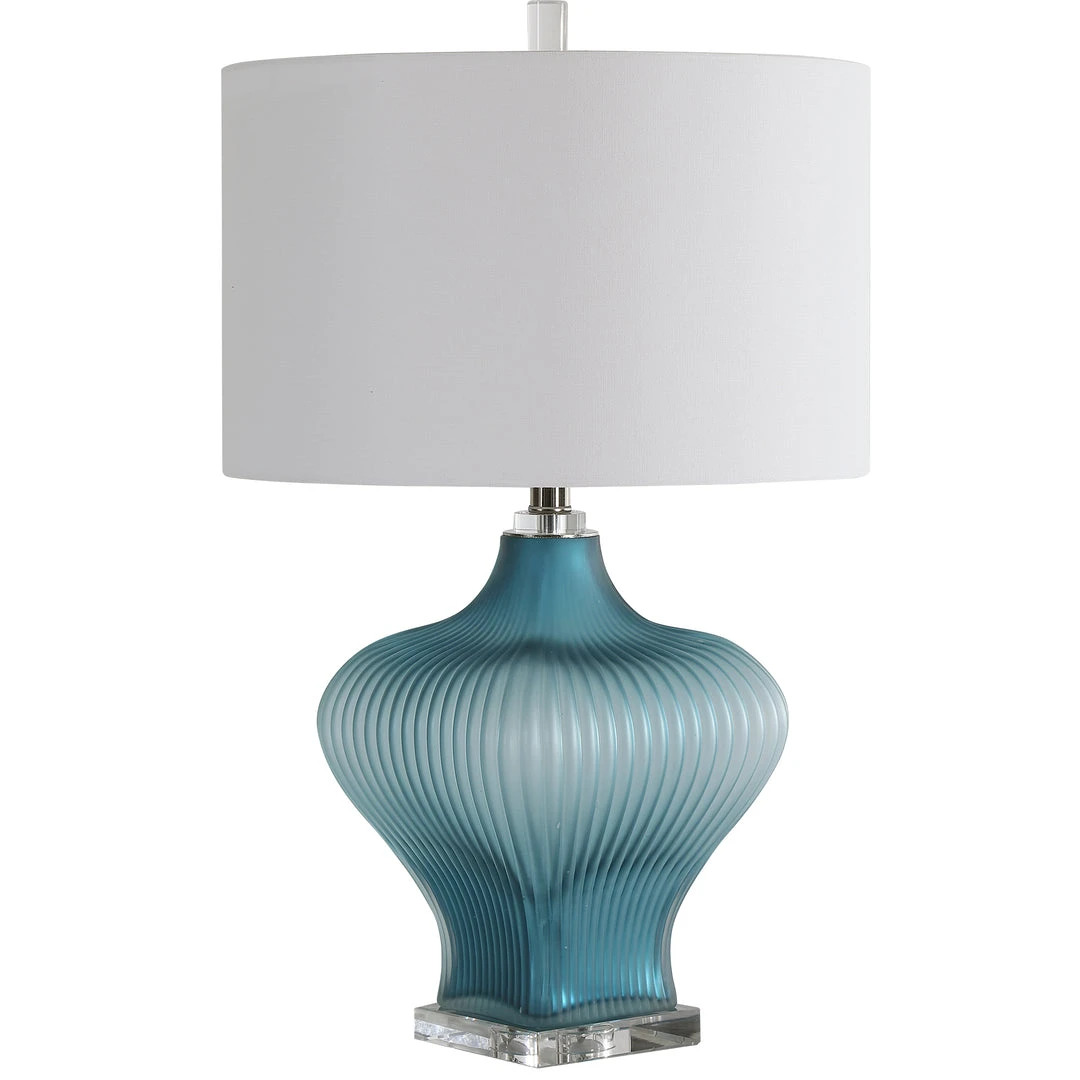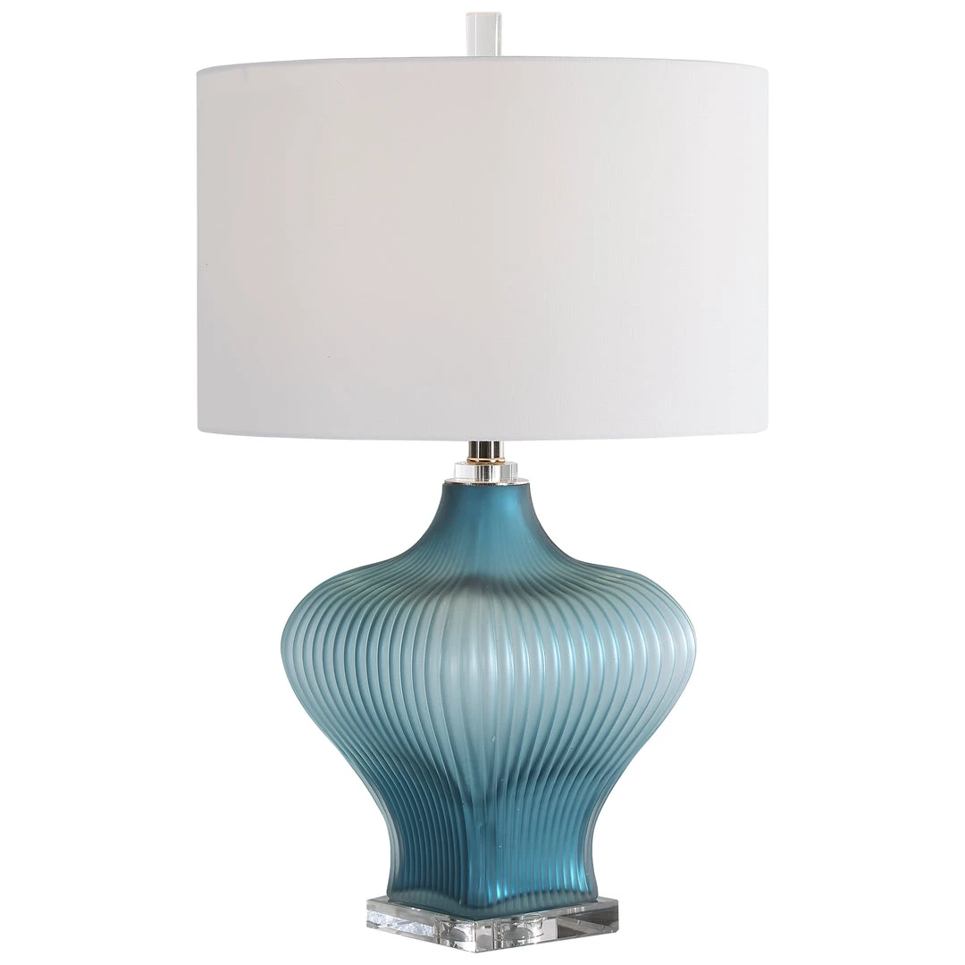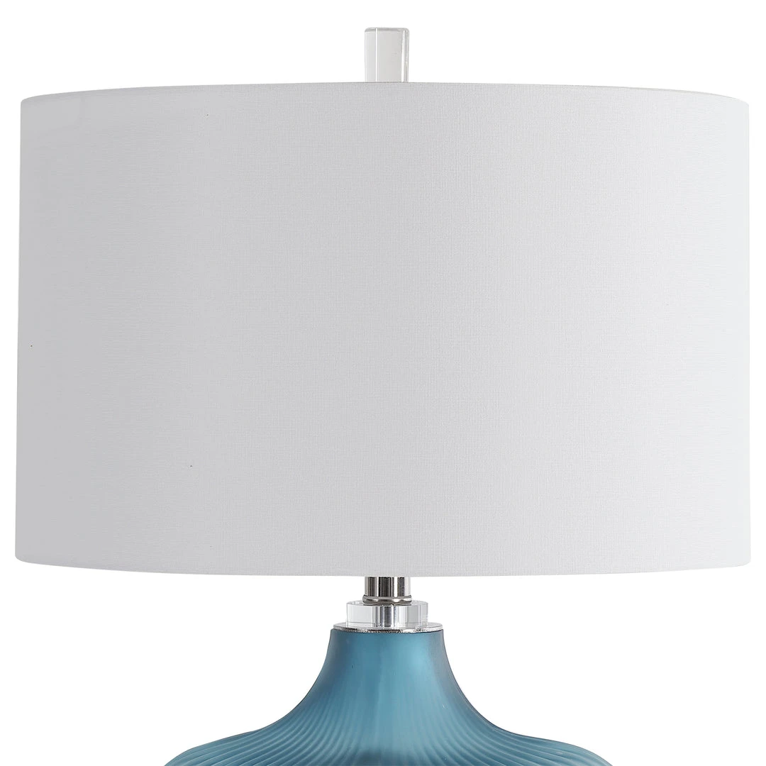 Showcasing A Classic Look, This Table Lamp Features A Frosted Turquoise Glass Base With Elegant Curves And Fluted Details. A Large Crystal Foot And Additional Crystal Accents Help Create The Sophisticated Look. A White Fabric Drum Shade Accents This Lamp.