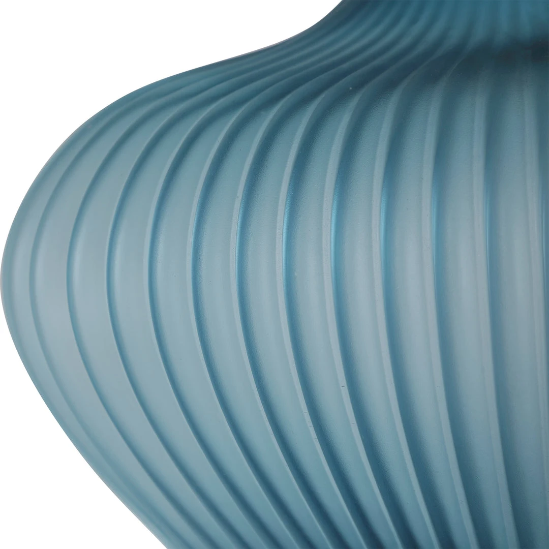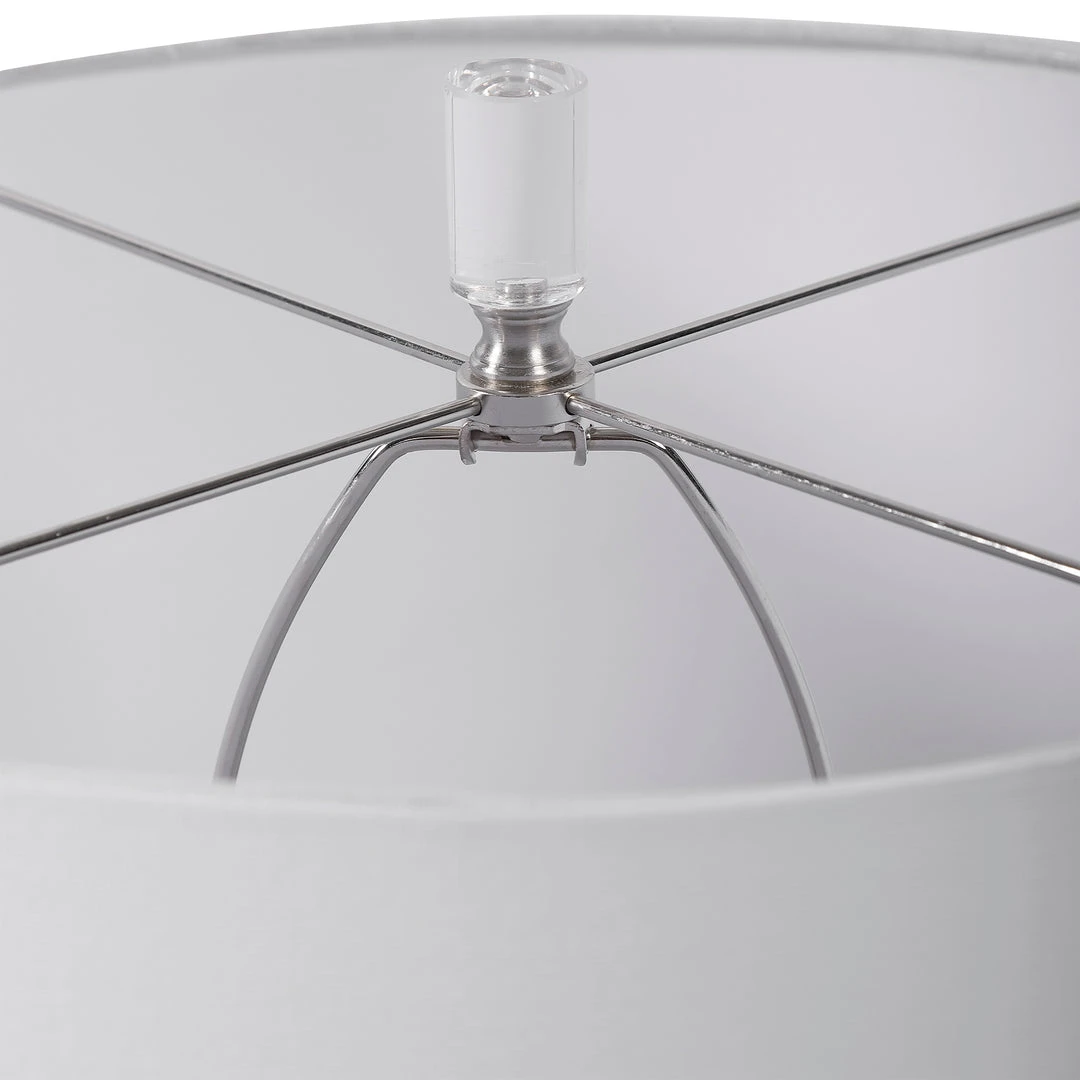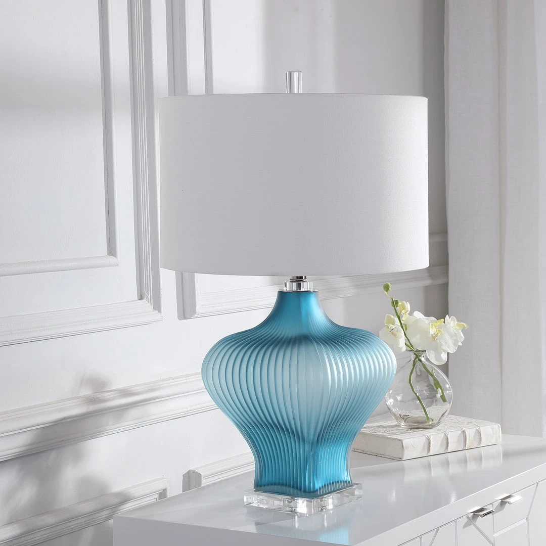 Showcasing A Classic Look, This Table Lamp Features A Frosted Turquoise Glass Base With Elegant Curves And Fluted Details. A Large Crystal Foot And Additional Crystal Accents Help Create The Sophisticated Look. A White Fabric Drum Shade Accents This Lamp.
