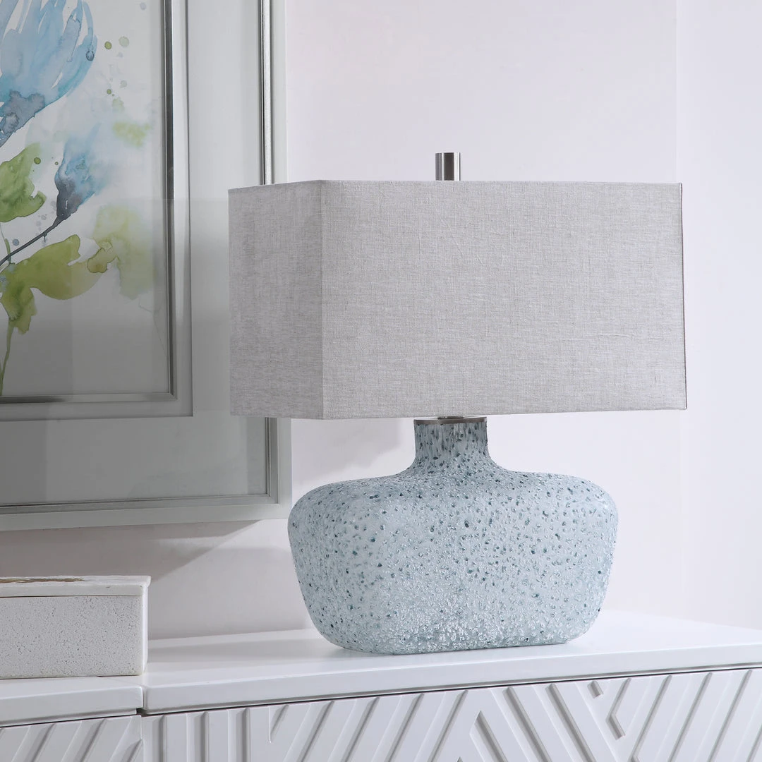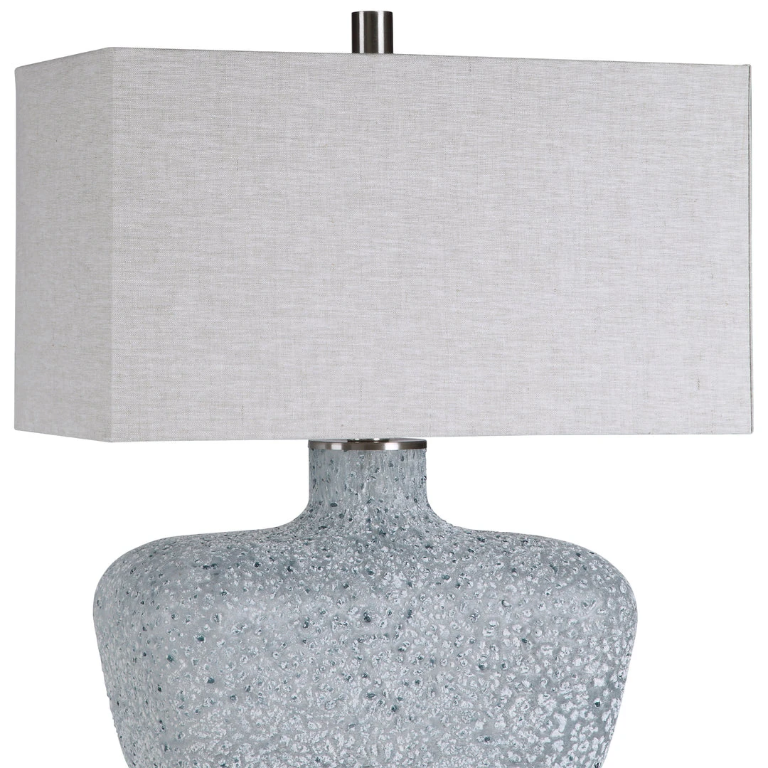 This Table Lamp Features A Heavily Textured Art Glass Base With A Hand Crafted Look In Mottled Highlights Of Blue Green, Covered In An Aged White Frosted Glaze, Paired With Brushed Nickel Plated Details. The Rectangle Shade Is A Light Gray Linen Fabric With Natural Slubbing.