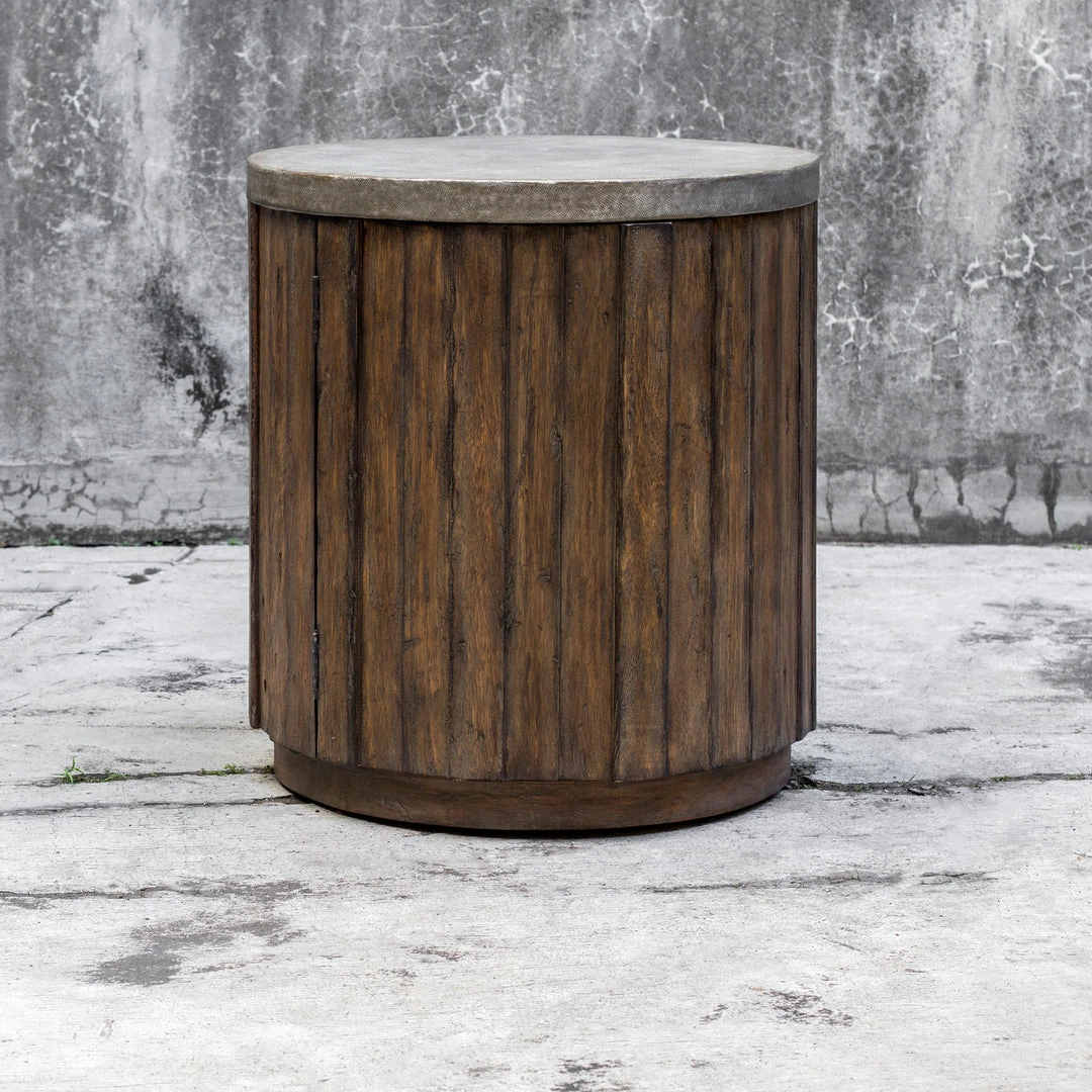 Handcrafted From Select Hardwoods In A Vineyard Fruitwood Stain, Pieced To Create This Multi Dimensional Base Complete With A Hidden Storage Door That Reveals One Interior Adjustable Shelf. Finished With A Hammered Sheet Metal Top In A Pewter Glaze.