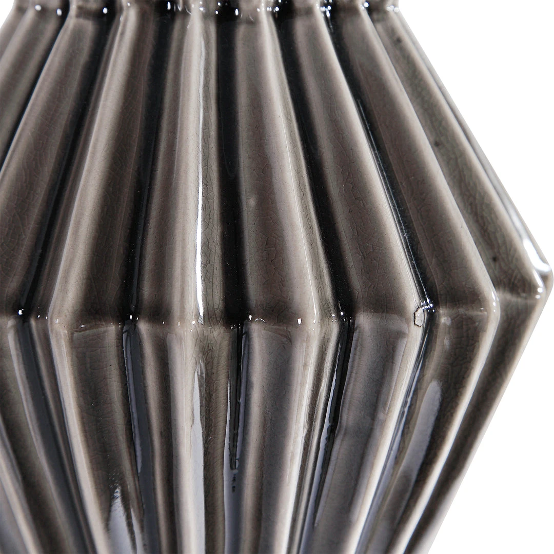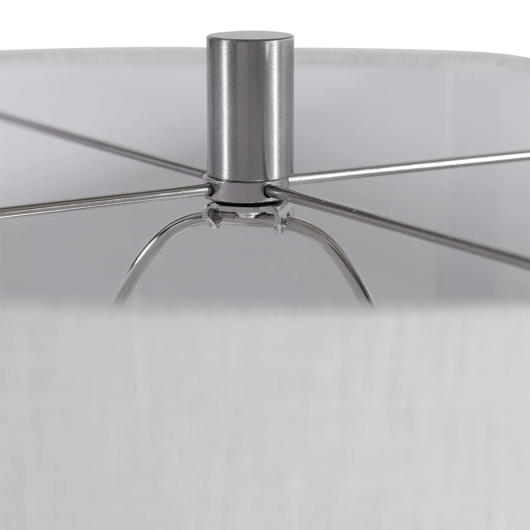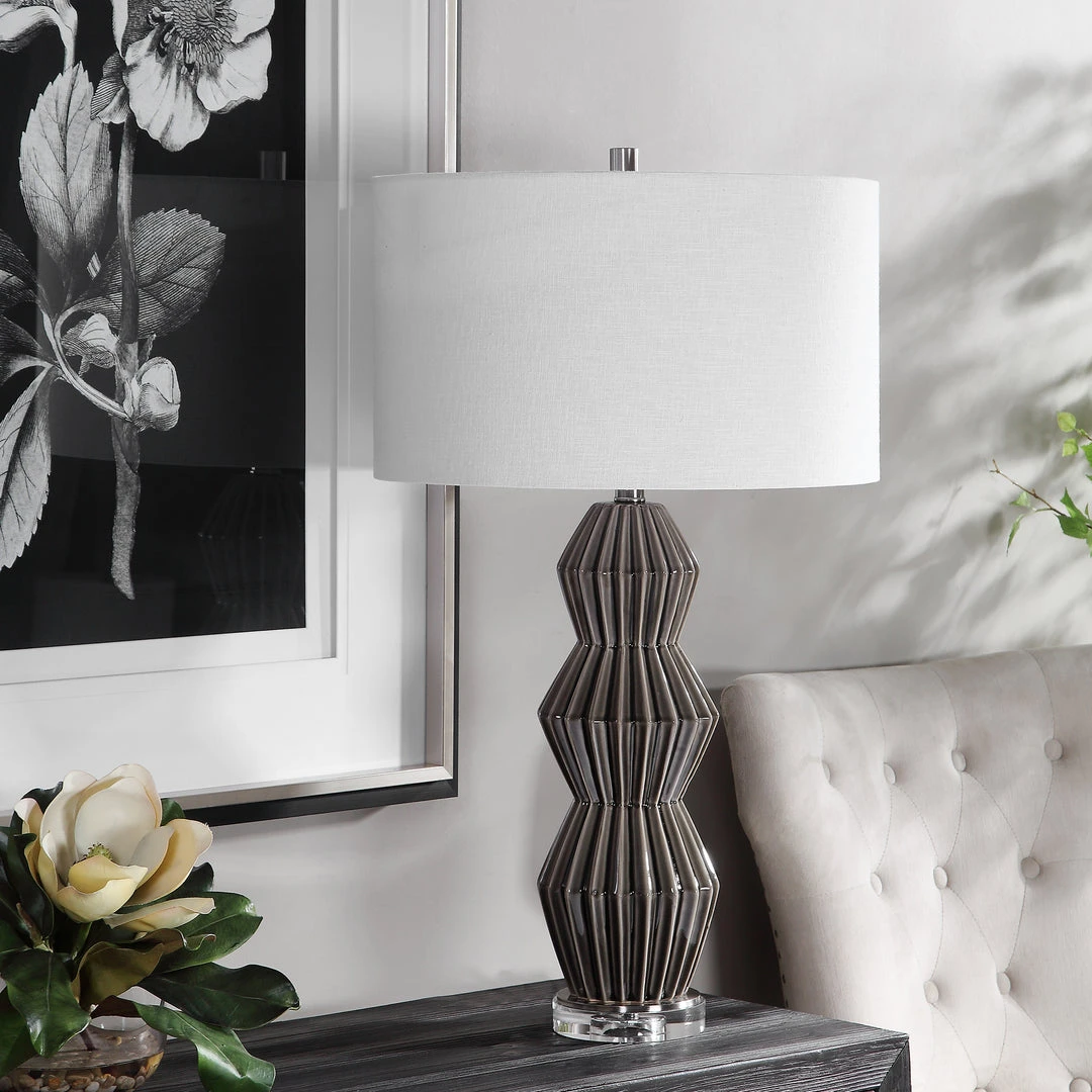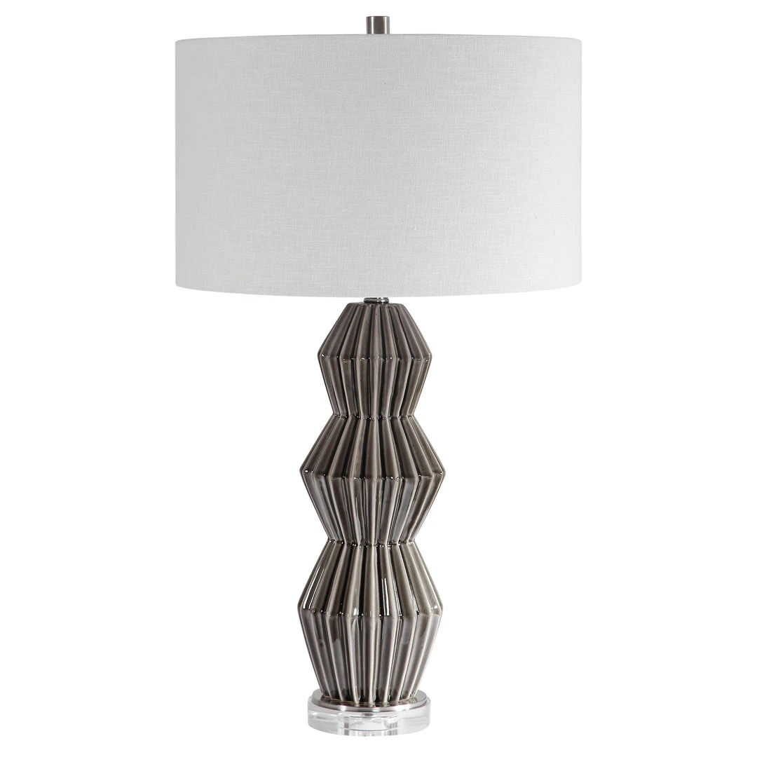 This Table Lamp Features A Retro, Geometric Styled Ceramic Base Finished In A Smokey Gray Glaze With Ribbed Texture, Accented With Brushed Nickel Plated Details And A Thick Crystal Foot. The Hardback Drum Shade Is A White Linen Fabric With Natural Slubbing. Due To The Nature Of Fired Glazes On Ceramic Lamps, Finishes Will Vary Slightly.