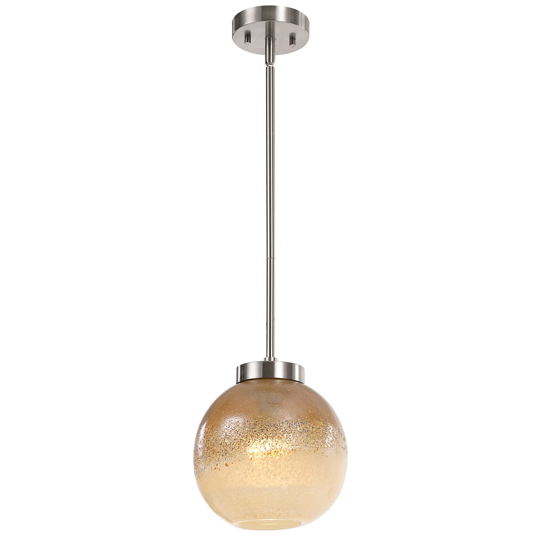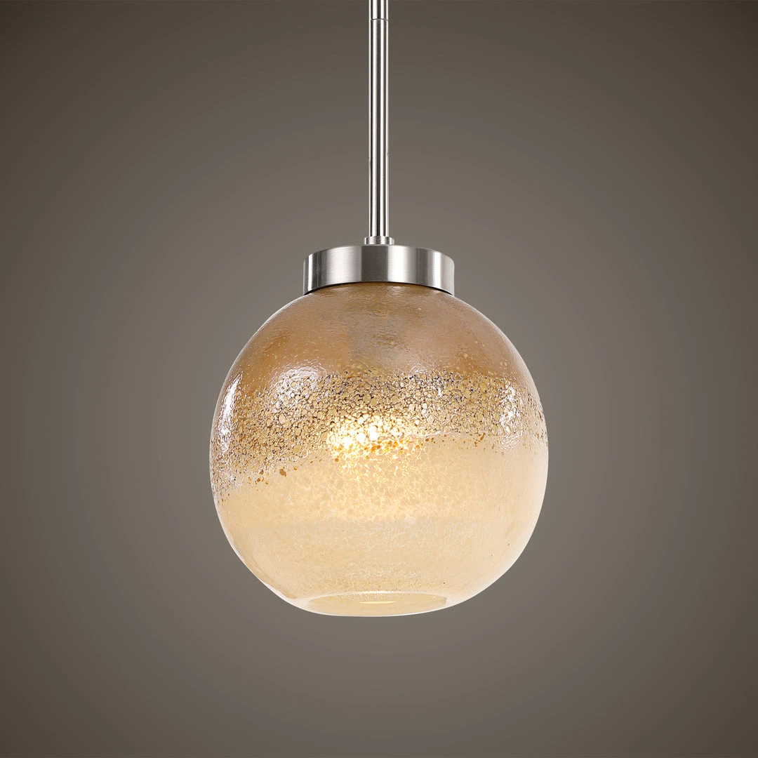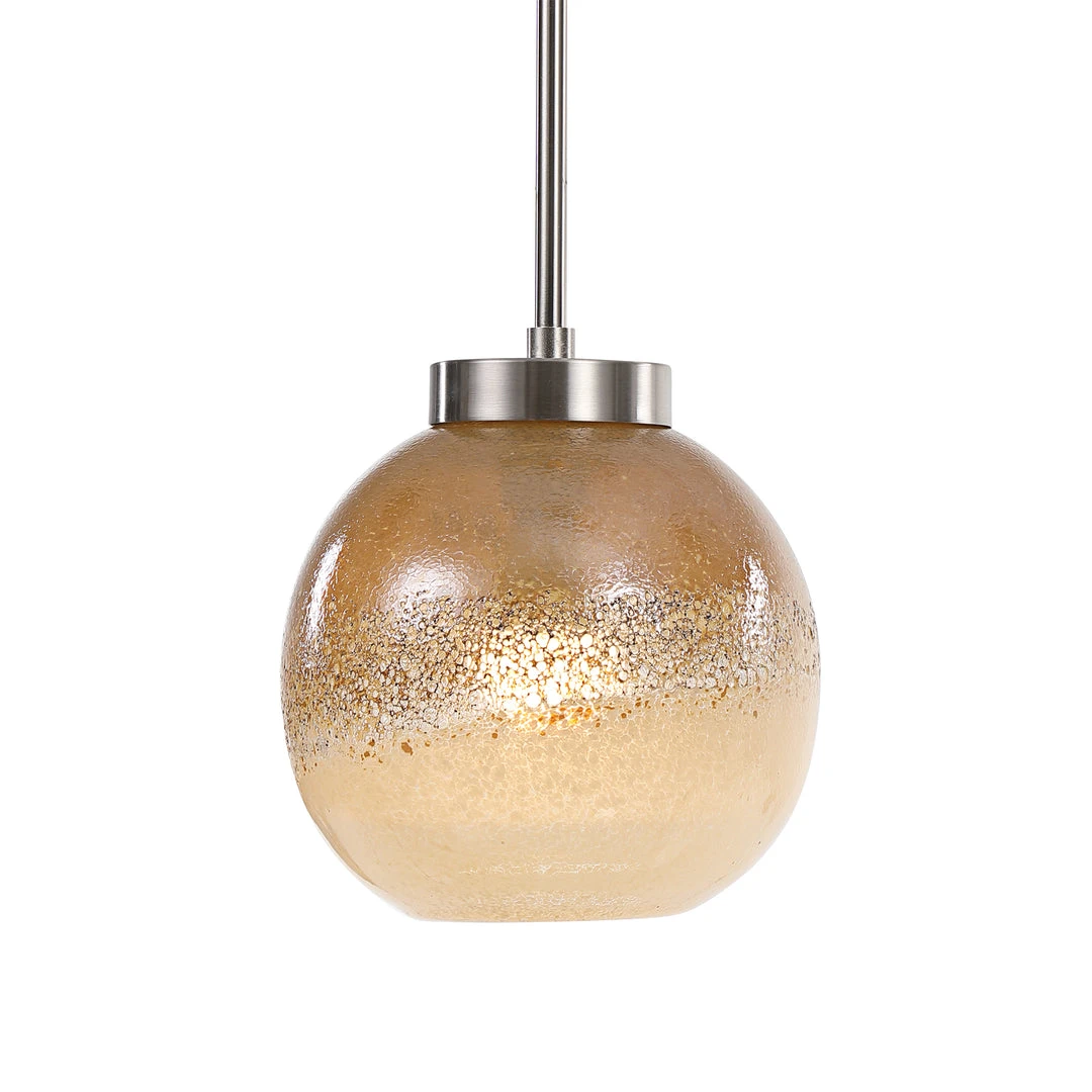 Unique Golden Amber Distressed Glass Is The Focal Point Of This 1 Lt. Pendant With A Brushed Nickel Finish. Each Piece Of Glass Is Mouth Blown With A Wonderful Handmade Quality And No Two Pieces Are Exactly Alike. With 1-60 Watt Max Edison Socket. Supplied With 15 Wire, 3-12″ Stems And 1-6″ Stem For Adjustable Installation.