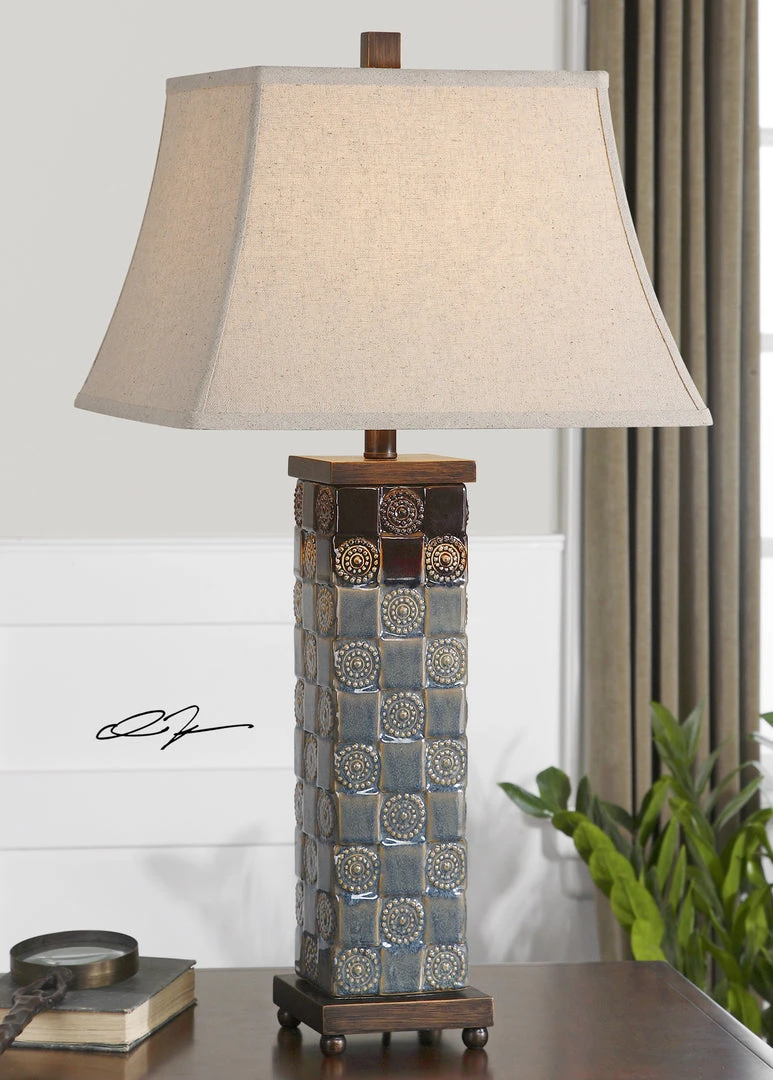 Textured Ceramic Base Finished In A Distressed Dark Blue Glaze With A Dark Bronze Drip. The Square Bell Shade Is An Oatmeal Linen Fabric With Natural Slubbing.
