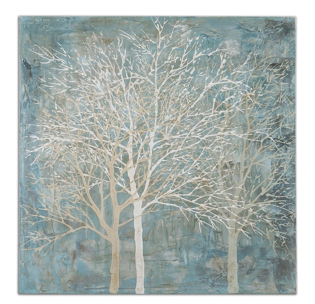 Hand Painted On Canvas, This Landscape Artwork Features A Contemporary Style. Metallic Silver, Gold, And Champagne Silver Trees Are Set Against A Lightly Textured, Mottled Light Blue And Beige Background. The Canvas Is Stretched And Attached To A Wooden Frame. Due To The Handcrafted Nature Of This Artwork, Each Piece May Have Subtle Differences.